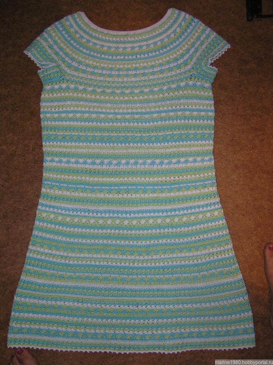 Платье связано из 100% хлопка (300 м 100гр). Хорошо держит форму. Выше колена на рост 167.