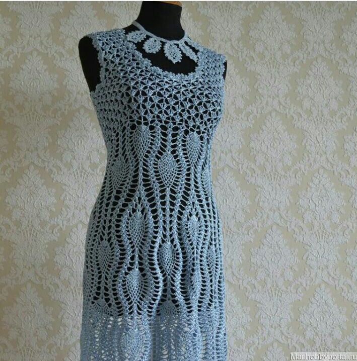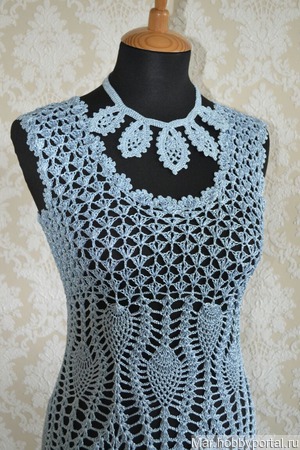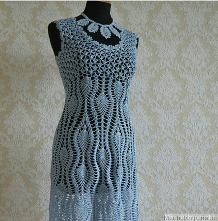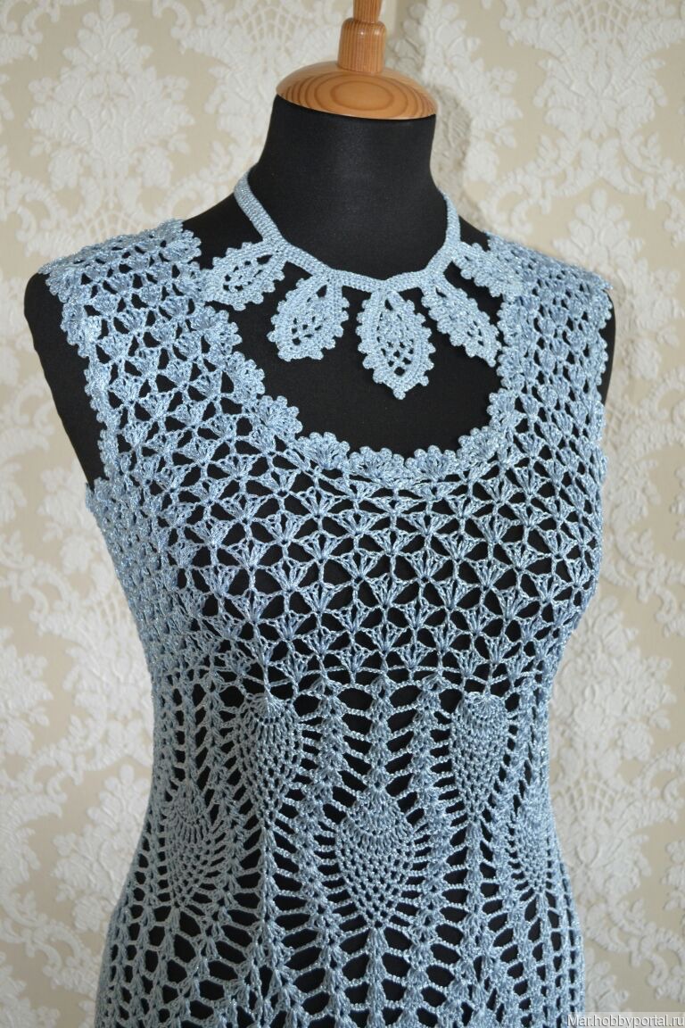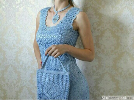 Платье связанно крючком из Вискозы с люриксом. К нему прилагается сумочка на молнии ,колье и вязанные серьги .