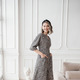 Верх сконструирован по типу кимоно: цельнокроеный рукав, элегантный V-образный вырез. Благодаря продуманному фасону, платье скрадывает недостатки, формируя женственный силуэт.