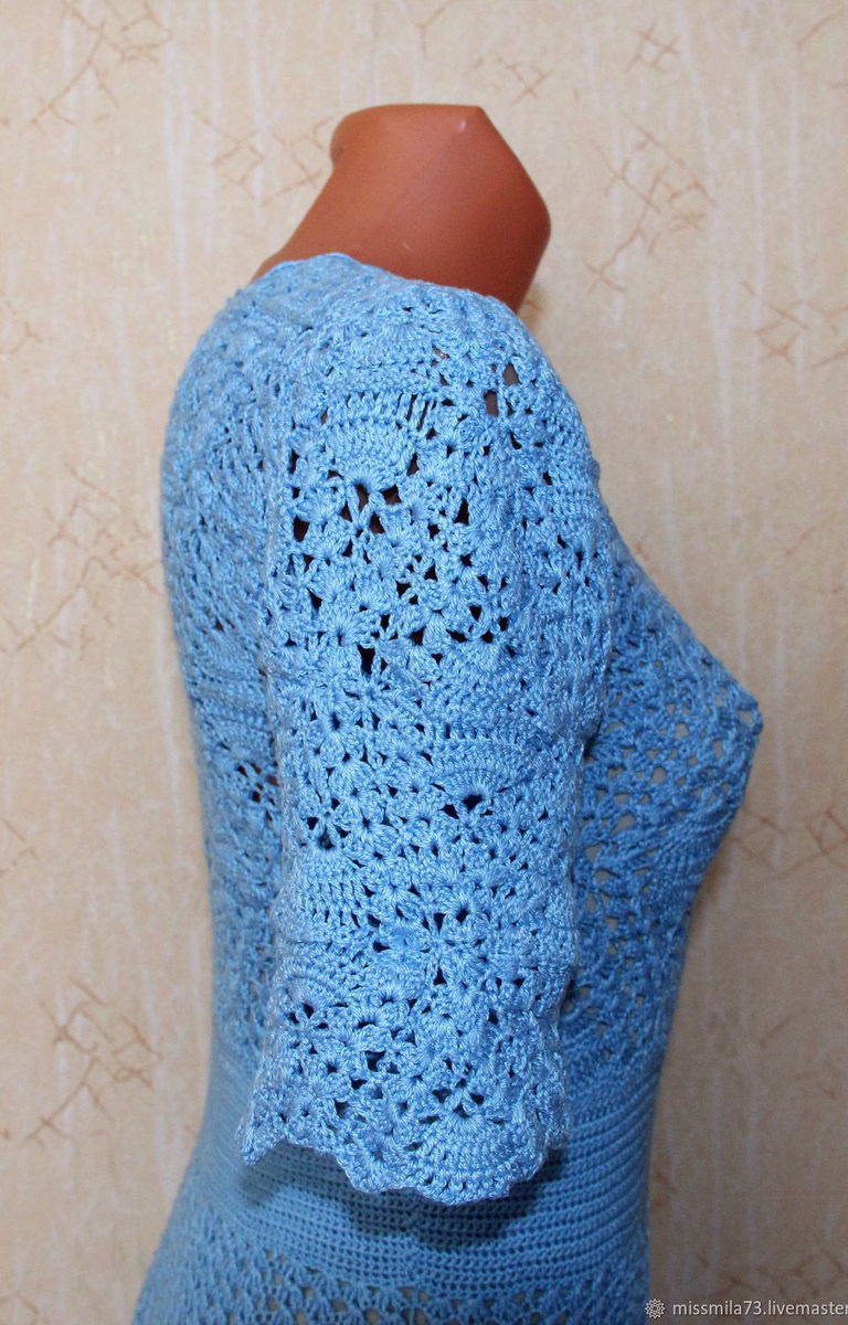 Ажурное платье изготовлено из пряжи хлопок-вискоза ("нарцисс") мотивами безотрывным способом, юбка безшовная, клешение - от линии бедер вниз. Рукава длиной 28см, общая длина платья 104см. Возможно повторение в Вашем цвете,размере, по Вашим пожеланиям
