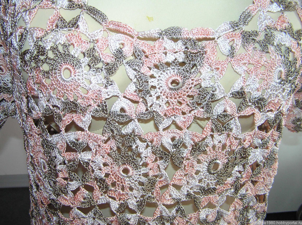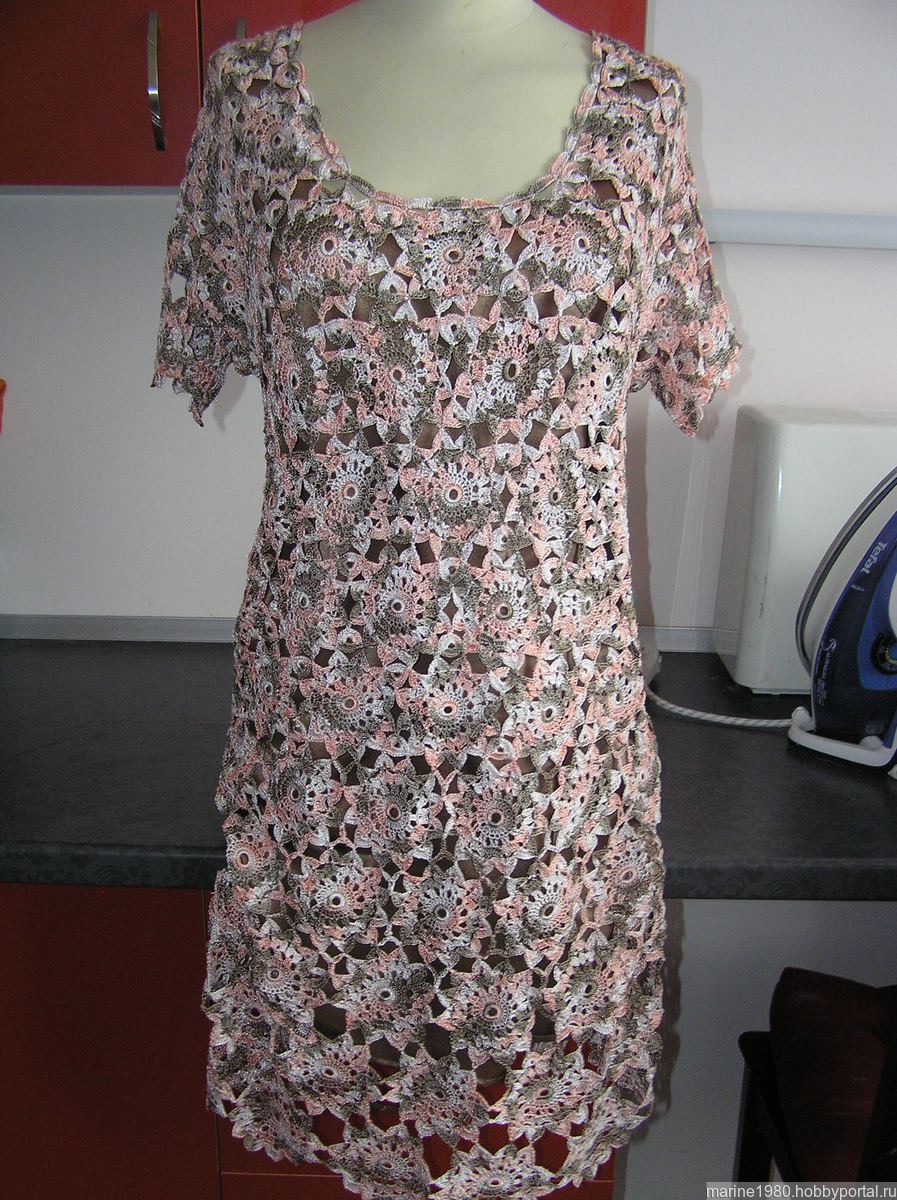 Платье связано из шелковистой струящейся переливающейся турецкой пряжи крючком мотивами.