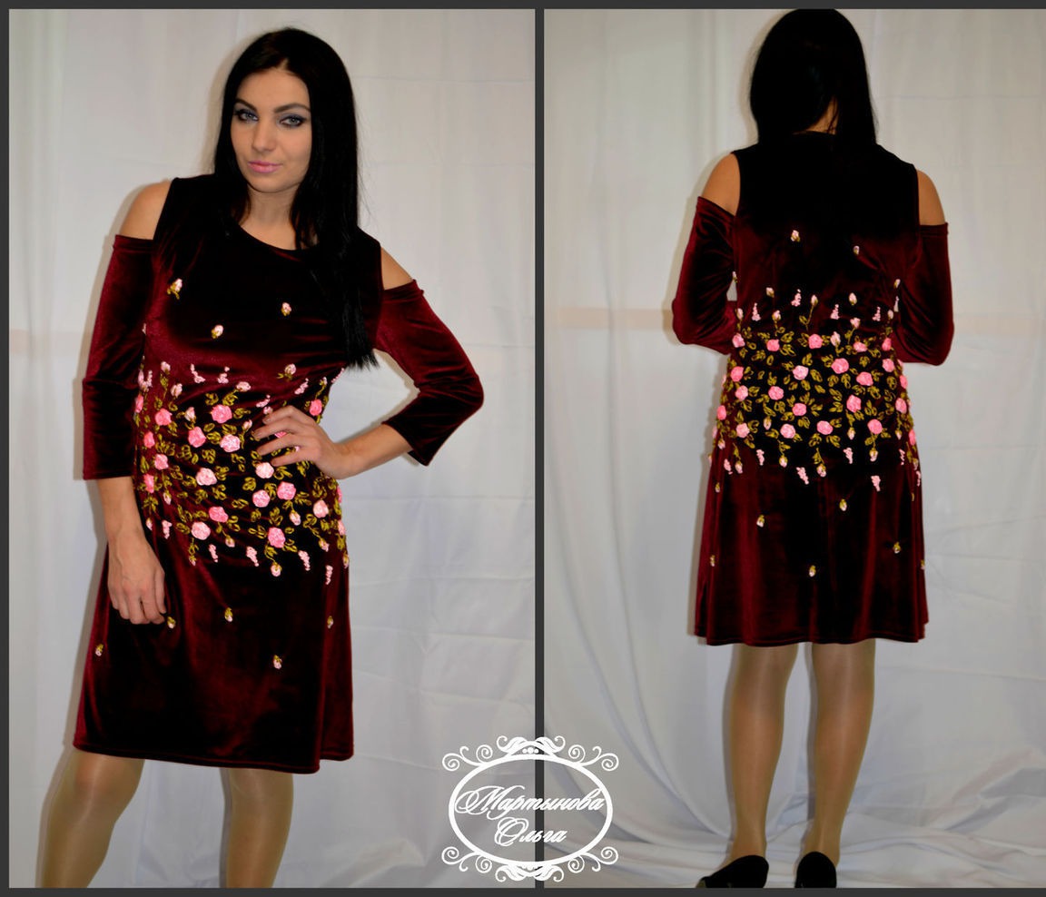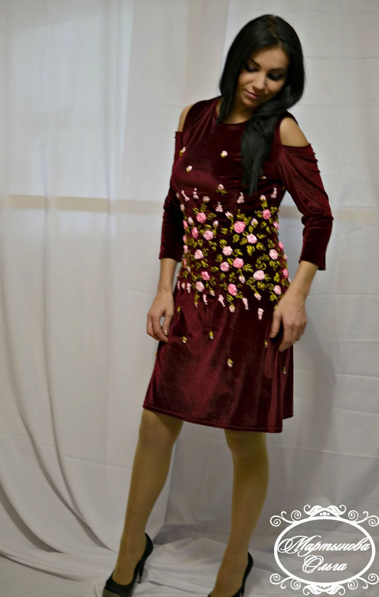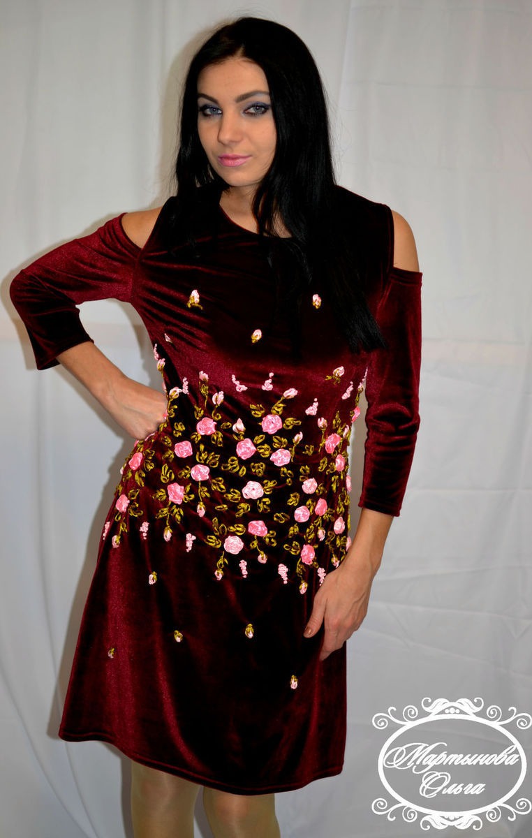 платье из велюра бархата бордового цвета украшено вышивкой лентами авторская работа . идеально подходит как нарядная одежда так и для повседневной носки .в таком платье вы будете чувствовать себя удобно и комфортно привлекая взгляды окружающих