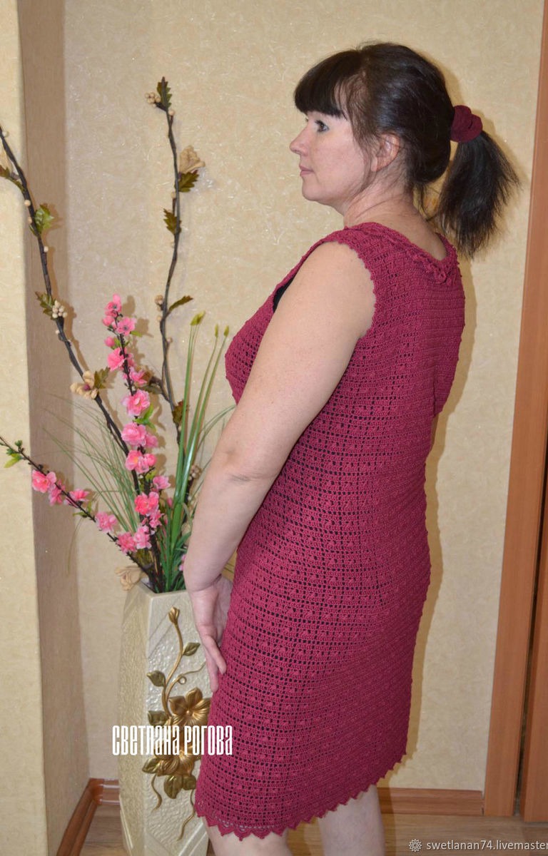 бордовый, платье вязаное, подарок на любой случай, платье летнее, ажурное платье крючком, ручная вязка