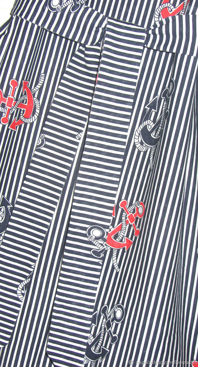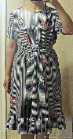 Платье миди в синюю полоску с красными и синими якорями, плотный х/б трикотаж , по низу волан, пояс в комплекте, длина платья 108 см, подойдет на размеры от 44-46 до 48-50. Платье свободного кроя, на любую фигуру. Мои параметры на фото : рост 163, 88-70-99.