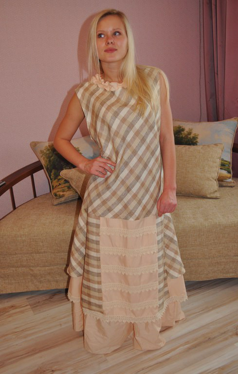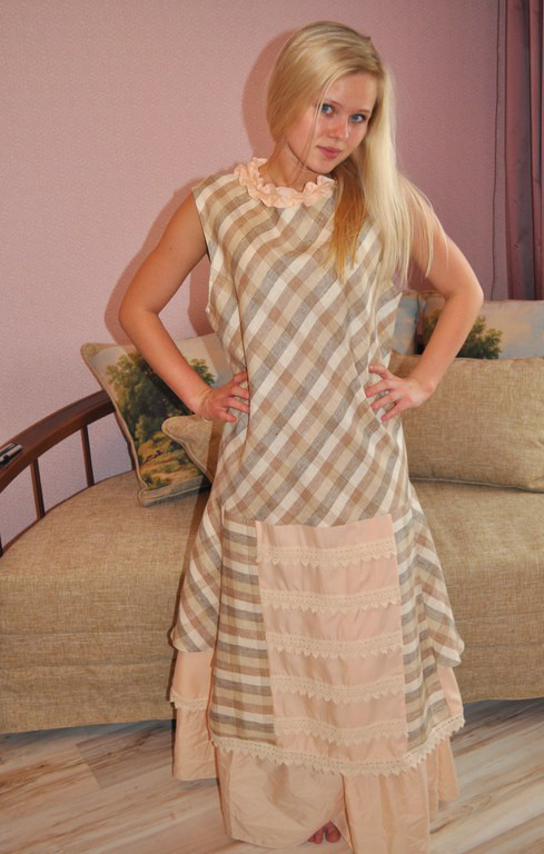 Платье из мягкого Вологодского 100% льна. Благодаря расклешенным боковым полотнищам юбка на сарафане приобретает пышность и модный А-силуэт. Отделка хлопком и кружевом. Сбоку потайная молния.