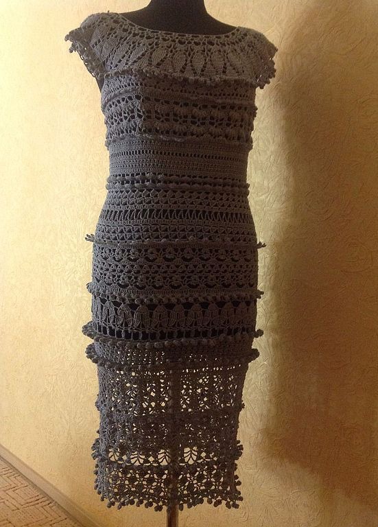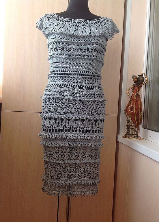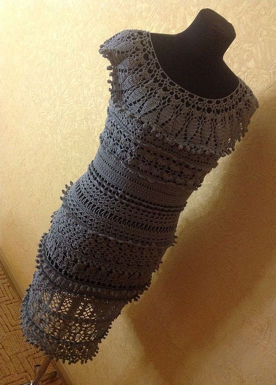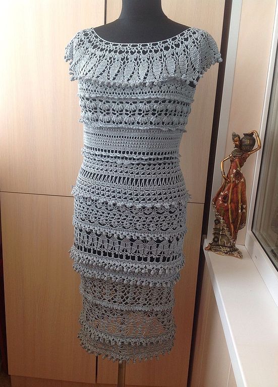 Платье вязаное крючком с хлопковой пряжи серо-жемчужного цвета. Платье очень ажурное. Размер платья подойдет на размеры 44-46.возможно довязать рукава это будет еще + 1000руб доплата.Длинна платья 98см.Цвет в реальности светлее,можно сказать как на последнем фото (начало вязки платья).