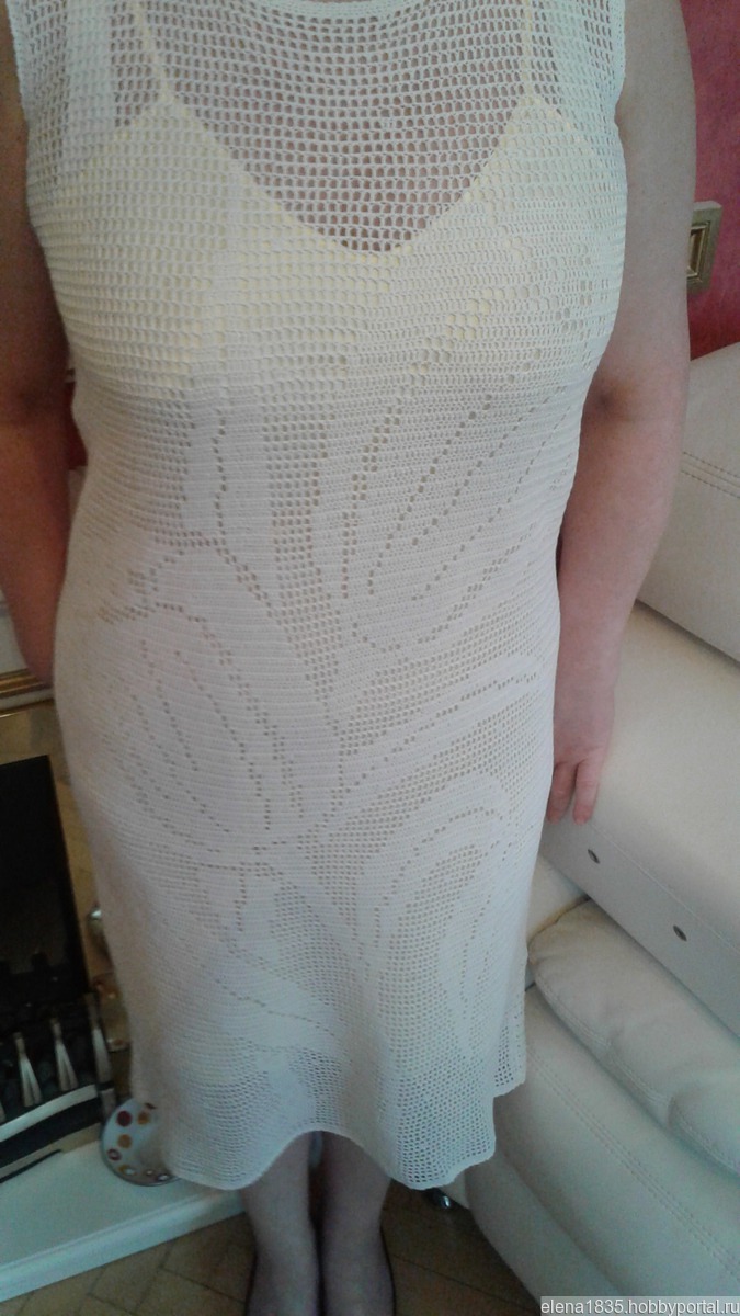 Летнее платье,связанное крючком из хлопка в технике филейной сетки.Очень тонкое и нежное.Приятное на ощупь.В летнюю жару в нём не будет жарко.