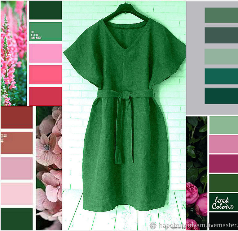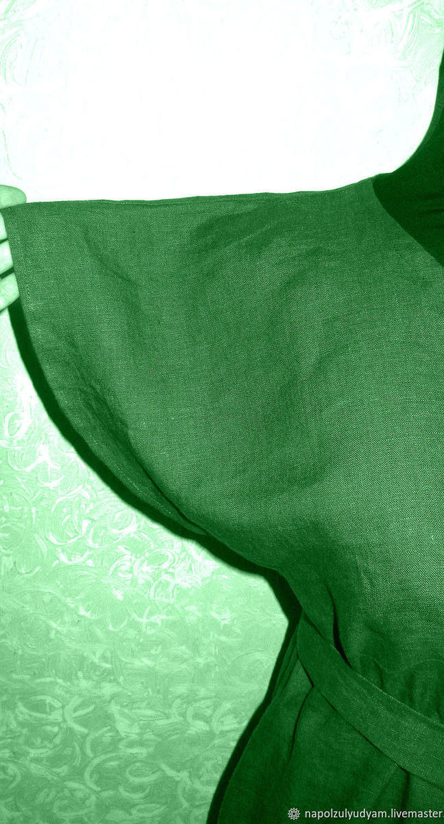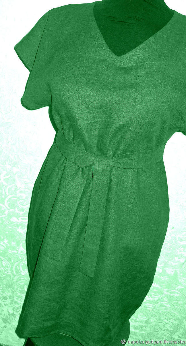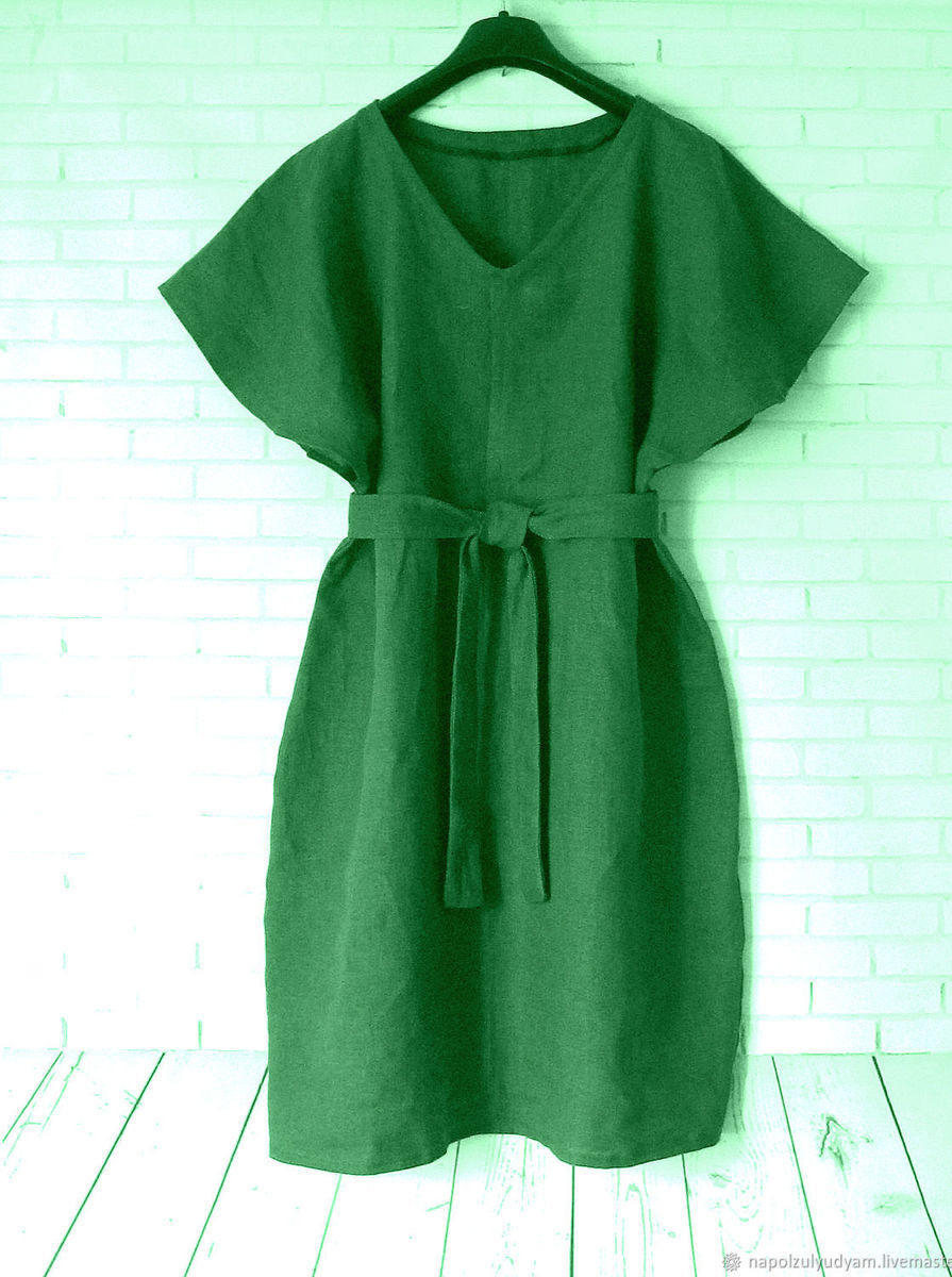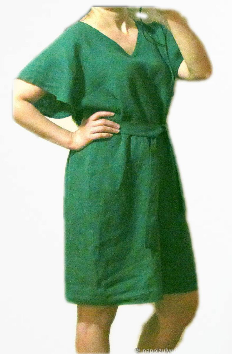 Платье-баллон с V-образной горловиной, рукавами-крылышками и поясом, сшито из 100% белорусского льна темно-зеленого " бутылочного" цвета. Ткань покупала в Минске. Длина платья 95 см. Размер - 46-50 ( грудь 92-100, бедра до 110 см) . Платье-баллон - это значит, что к бедрам оно расширяется, а затем сужается книзу, т.е. такое платье отлично будет на фигуру "груша" , когда бедра больше, чем грудь. НО! - если у вас бедра меньше, чем грудь , или размер меньше указанного - тогда платье могу ушить по вашим меркам, например сделать его прямым.