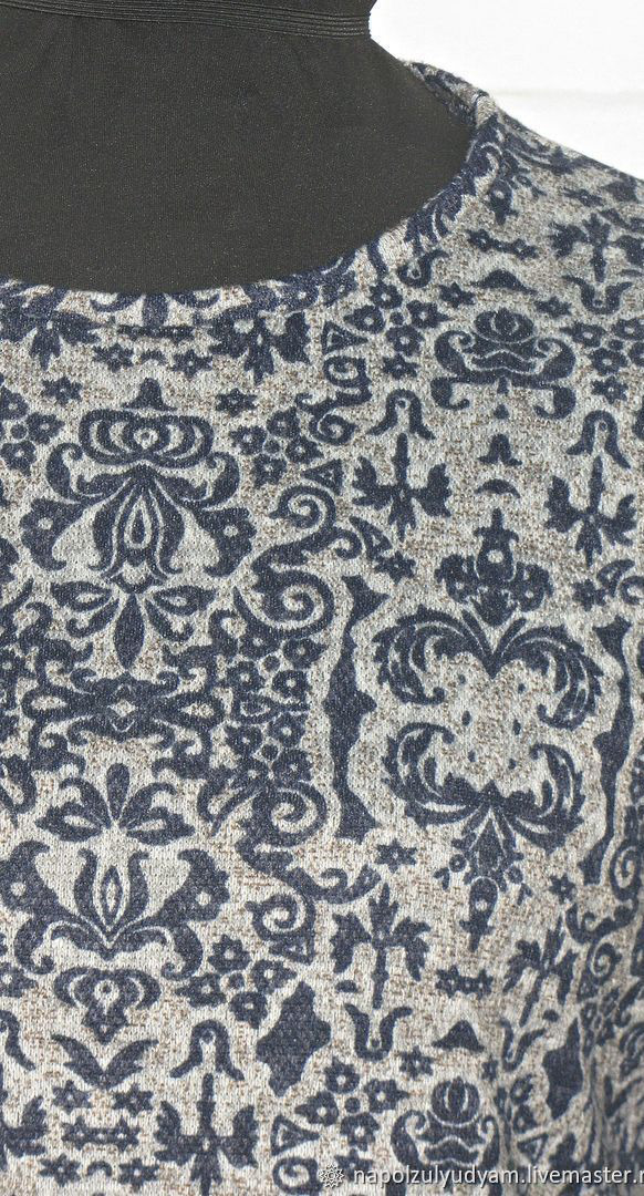 Темно-синие вензеля на сером фоне с бежевыми вкраплениями. Платье сшито из теплой трикотажной ангоры ( 15% шерсть 80% пэ 5% эластан), сезон осень/зима. Платье на каждый день, в офис и т.д. Длина платья 95 см, подойдет на размеры 44/46 - 46/48. На фото - рост 163, грудь 90, бедра 100.