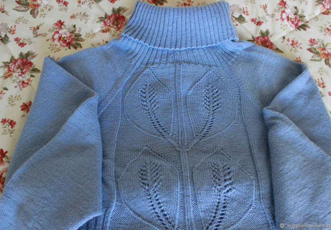 Платье голубого цвета. Связано из тонкой качественной шерстяной пряжи тонкими спицами, без швов. Шерсть мягкая, абсолютно не колется, поверхность бархатистая. Платье приталенное. Смотрится как машинная вязка. Подойдет на размер 48 - 50.