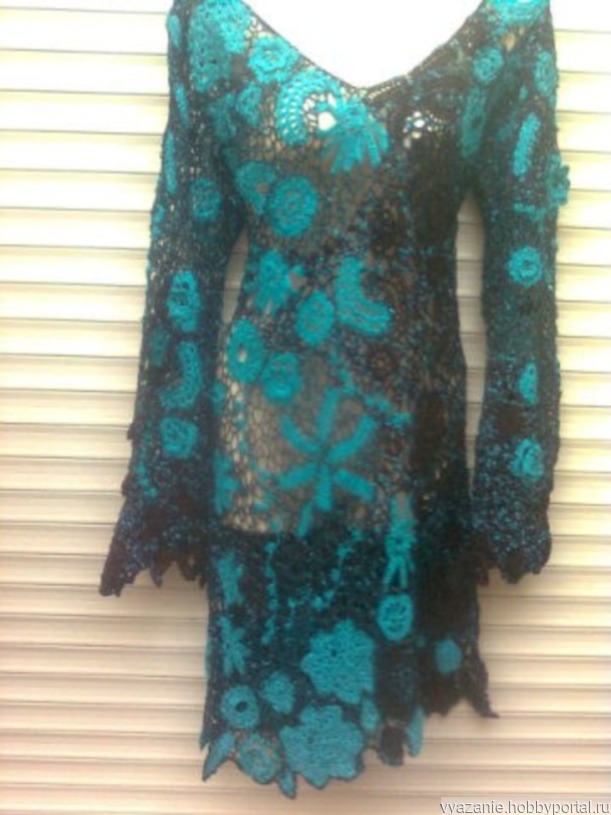 Платье вязаное в технике ирландского кружева.в нём использовалось 4 вида пряжи,2 оттенка бирюзового, черный и серебряный .Возможно связать на заказ,так же в других цветах,другого размера,длинны и формы.От этого и будет зависеть стоимость работы Данное платье очень красивое.Скрадывает полноту и выгодно подчёркивает достоинства фигуры. Прекрасно подойдёт для любого торжества.Украсит и девушку и зрелую женщину.