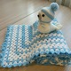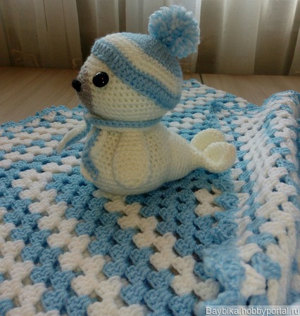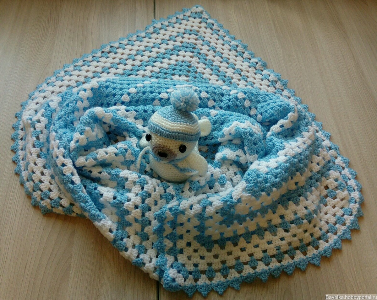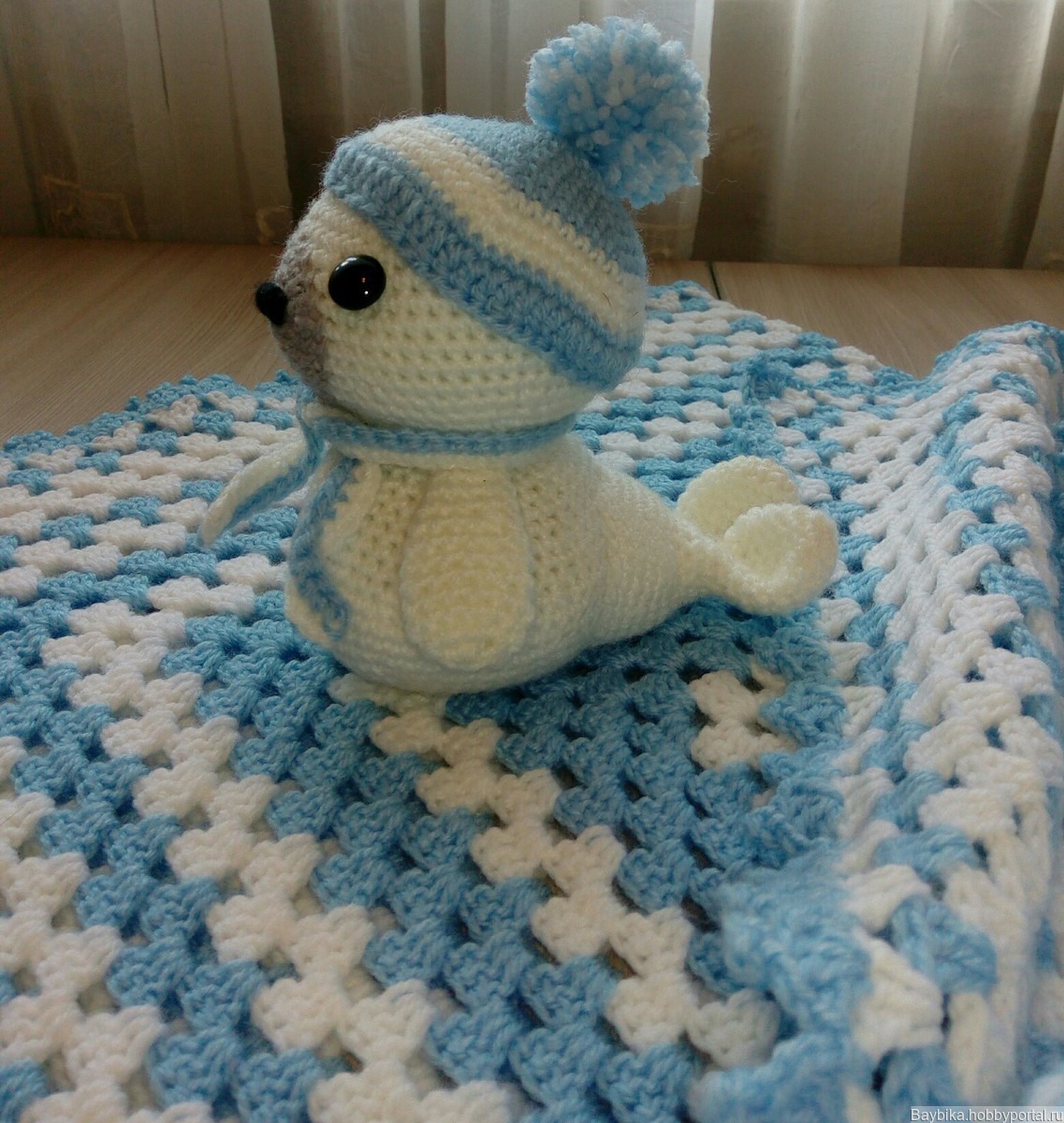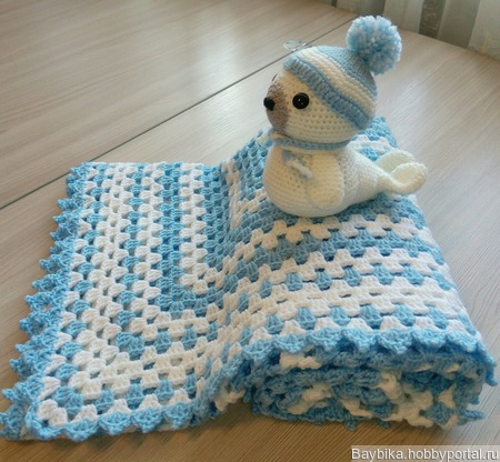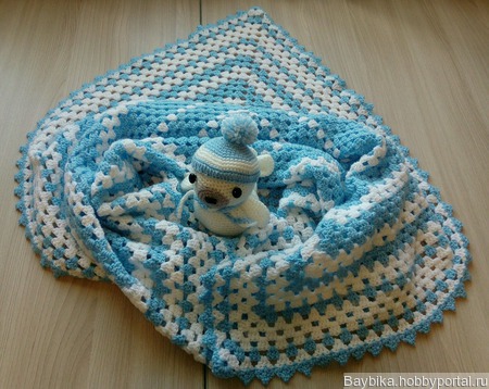 Плед детский для мальчика с игрушкой,связан крючком из детского акрила,размер пледа 81см на 81см,игрушка 15см на 13см.