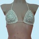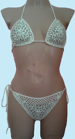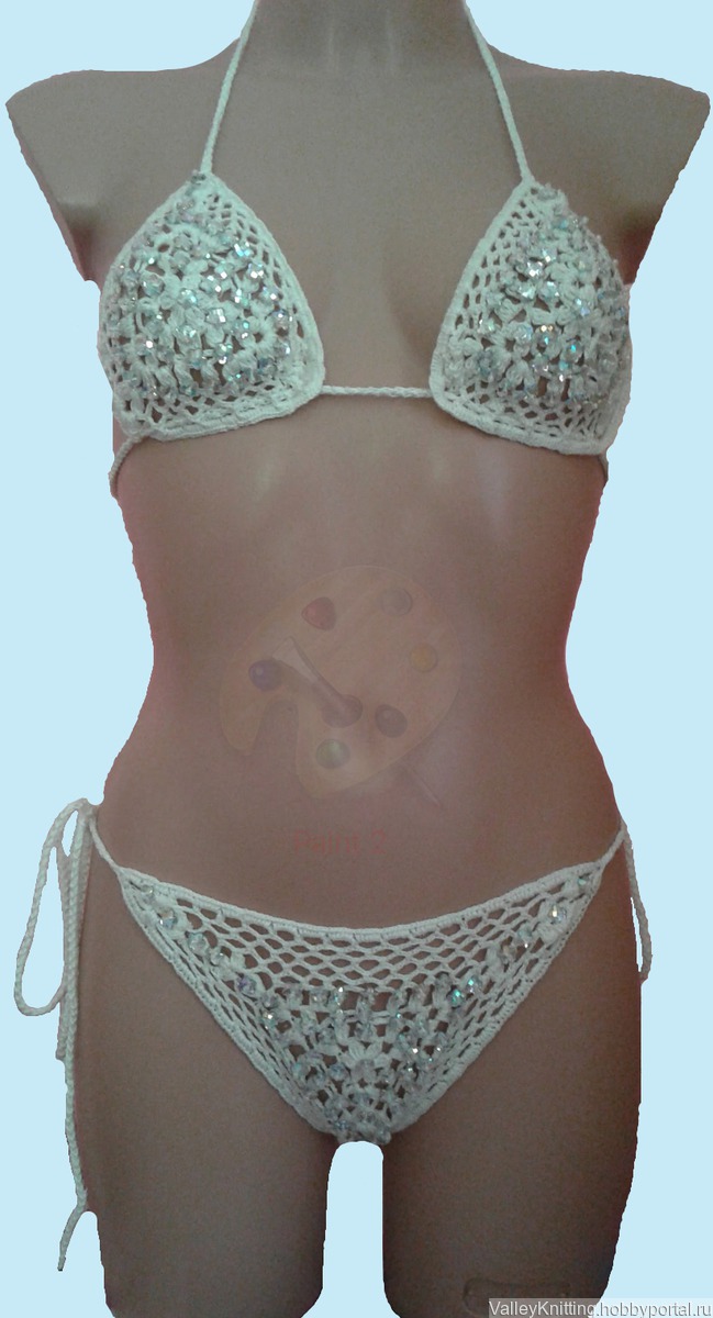 Купальник раздельный. Связан крючком, из нити хлопок-стрейч. Края обработаны силиконовой нитью стрейч, за счет чего купальник идеально держит форму. При носке и намокании не деформируется. Очень приятен к телу. По фигуре сидит идеально. Украшен бисером и стразами. Украшения пришиты качественно. За счет завязочек можно регулировать размер. Связан очень плотно. Работа качественная.
