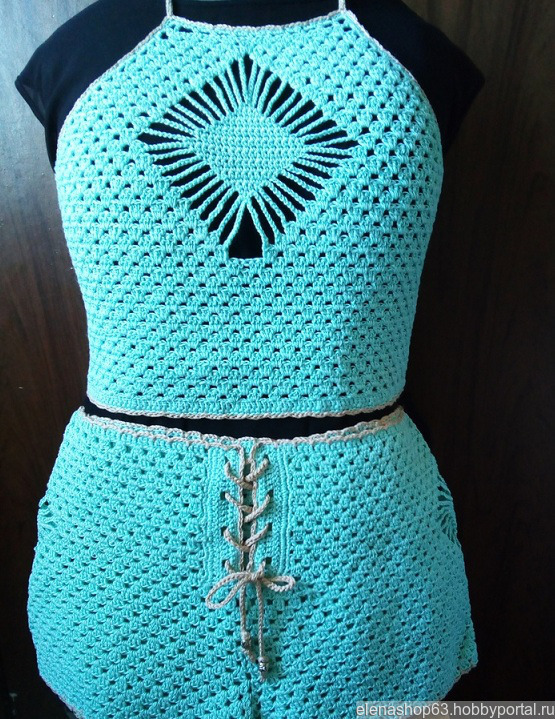Такой комплект будет незаменим на летнем отдыхе: он оригинальный, яркий и красивый - остаться незамеченной в нем просто невозможно. И Вы точно будете выделяться - являясь единственной обладательницей такого комплекта для летнего отдыха. Эта модель полностью соответствует летнему настроению, времени, когда душа требует легкости, а тело - ажура. Лето в таком комплекте будет ощущаться на все 100%.