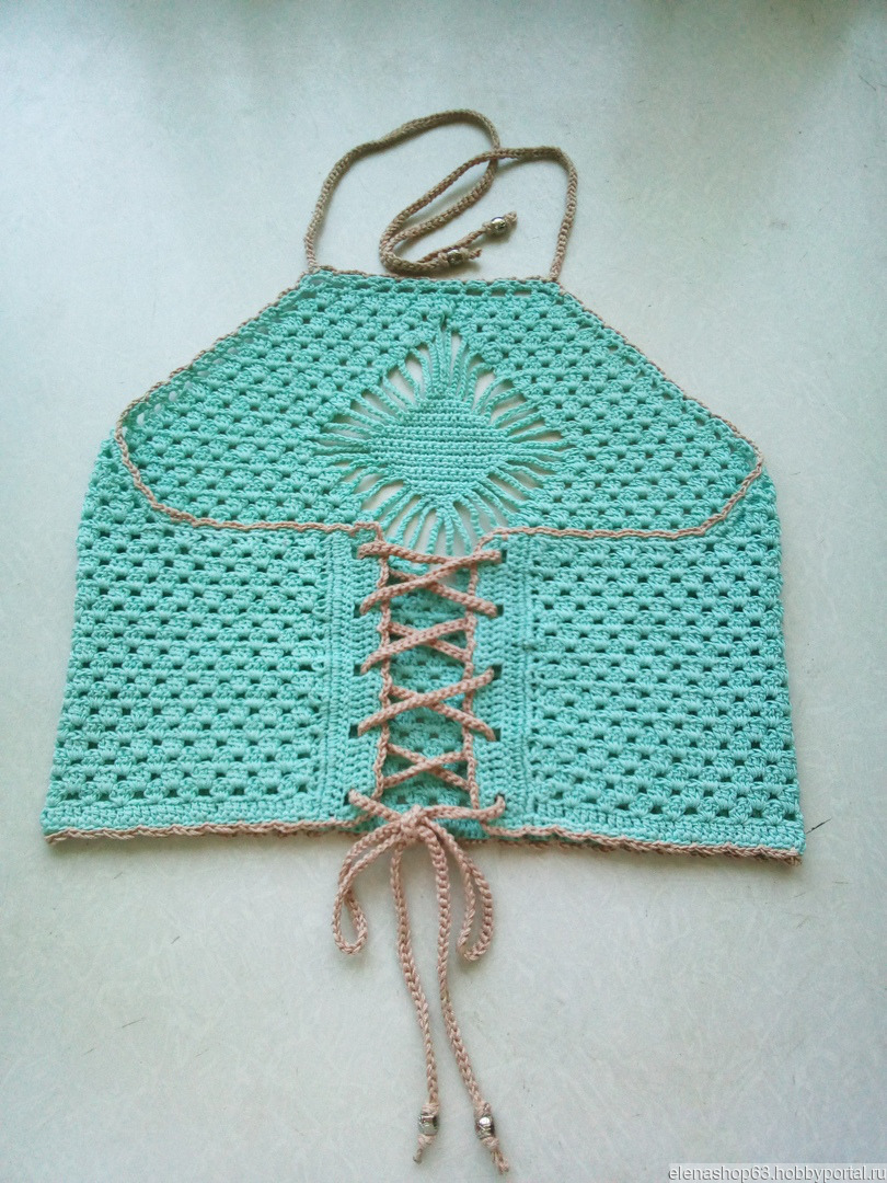 Хотите быть модной, сексуальной и красивой на отдыхе? Приобретите этот авторский летний комплект (44/46 р.), связанный крючком из 100% египетского мерсеризованного хлопка, состоящий из: шортиков и кроп-топа на шнуровке, обеспечивающей фиксацию точно по фигуре. Оригинальное украшение комплекта - большой центральный ажур "Паучок" на топе и "Паучки" поменьше - по бокам шорт. Топ имеет тонкие бретели, которые завязываются на шее или их можно закрепить на спинке топа.