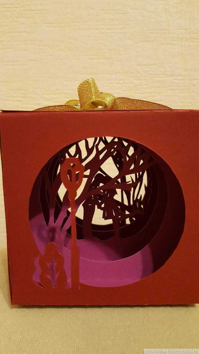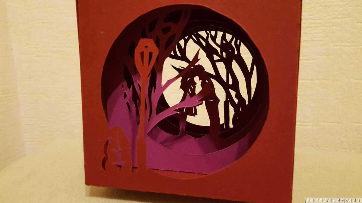 Перед Вами самый оригинальный подарок для любимого человека. Трехмерная открытка (или бумажный куб-тоннель) в виде коробочки с многослойным сквозным (смотреть можно и спереди, и сзади) пейзажем, центром которого является целующаяся пара. Открытка сделана из плотного дизайнерского картона. Внешний куб - темно-красного, ближе к бордовому, цвета, внутренние части вырезаны из картона сиреневого цвета. Пастельная гамма, приглушенные тона. Подойдет в качестве подарка и для девушки, и для молодого человека. Смотрится очень романтично. Завораживает, так и хочется заглянуть внутрь. Размеры 10?10?10см