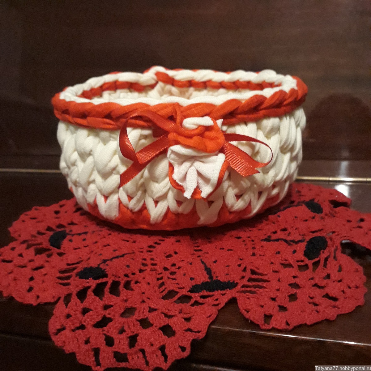 корзинка вязаная крючком из трикотажной хлопковой пряжи с декоративными украшениями