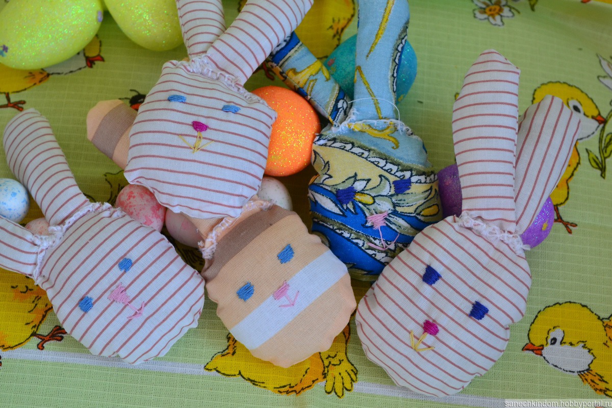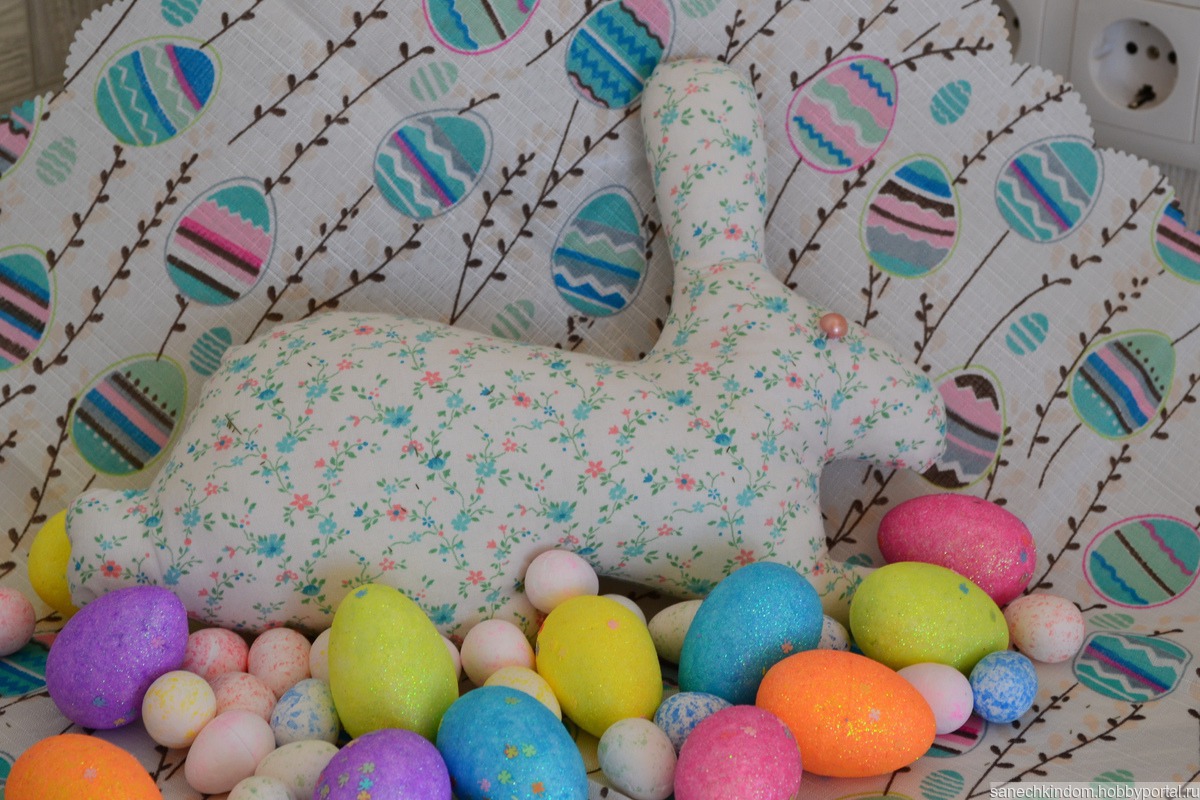 Пасхальный декор интерьера: кролик - 1шт., р-р 29см, яйца-кролики - 5 шт., р-р 7 см, сердце - 1шт., р-р - 10см. Текстиль с наполнителем.