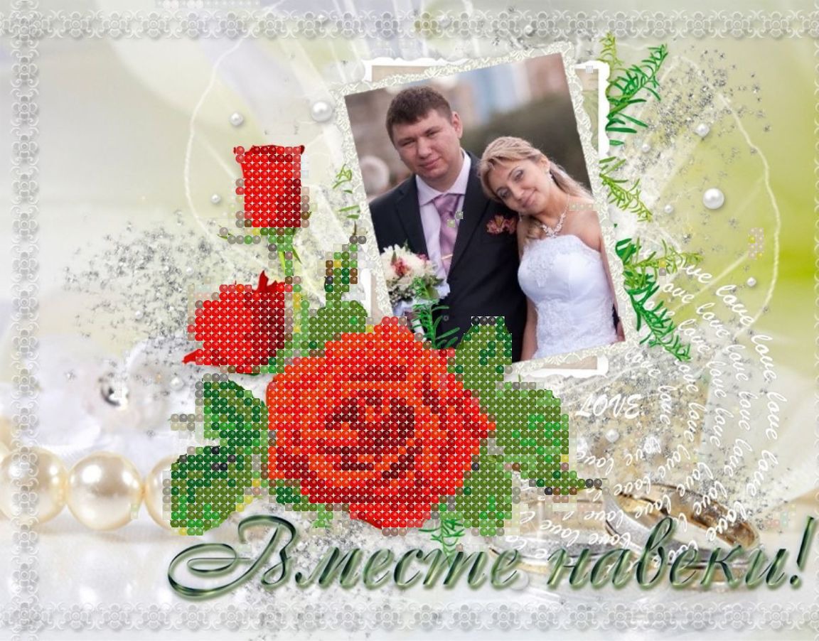 Фото жениха и невесты в рамке украшенной вышивкой из бисера- это воспоминания, эмоции и радость связанные с главным днём уже состоявшихся супругов.