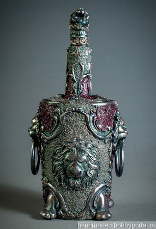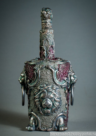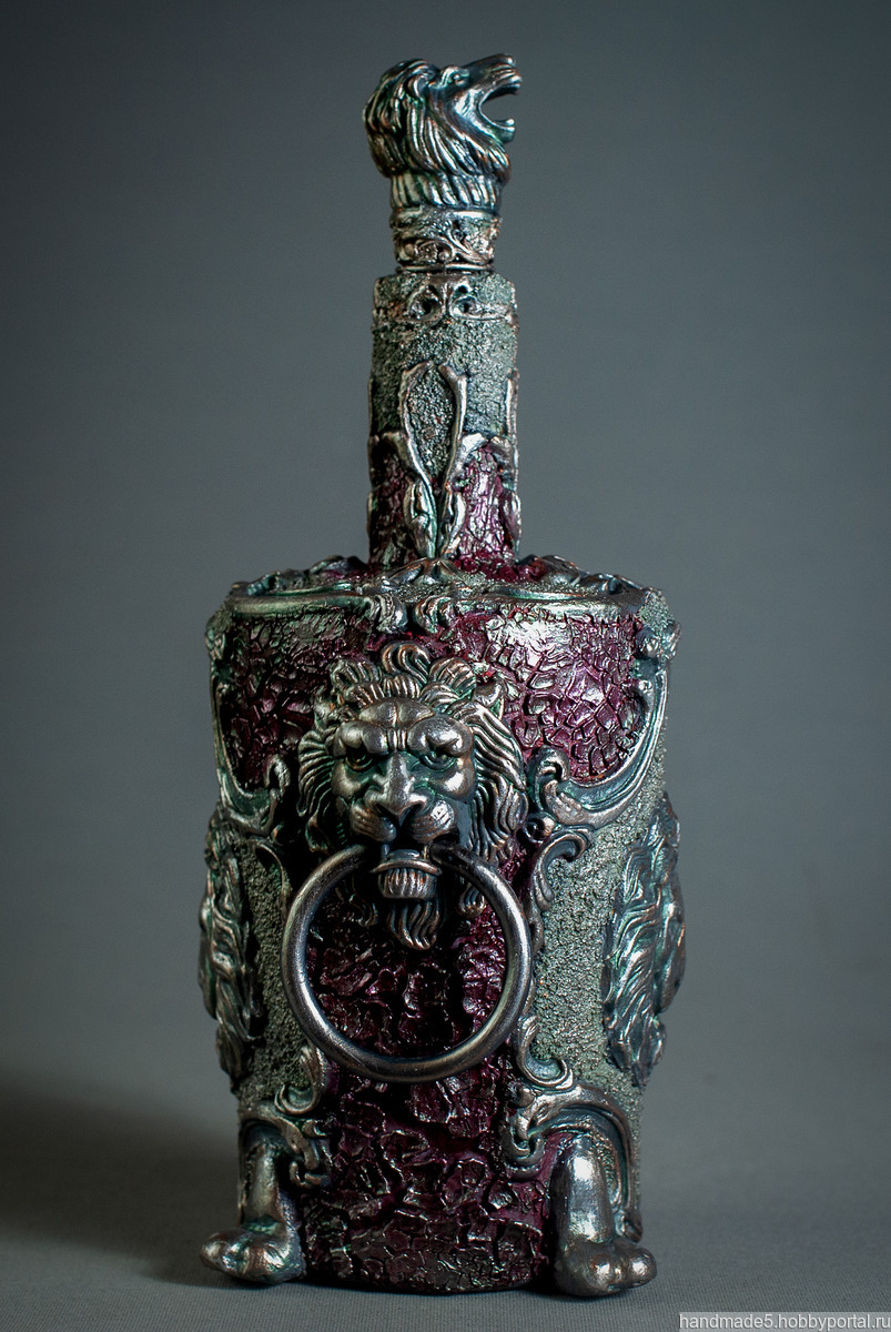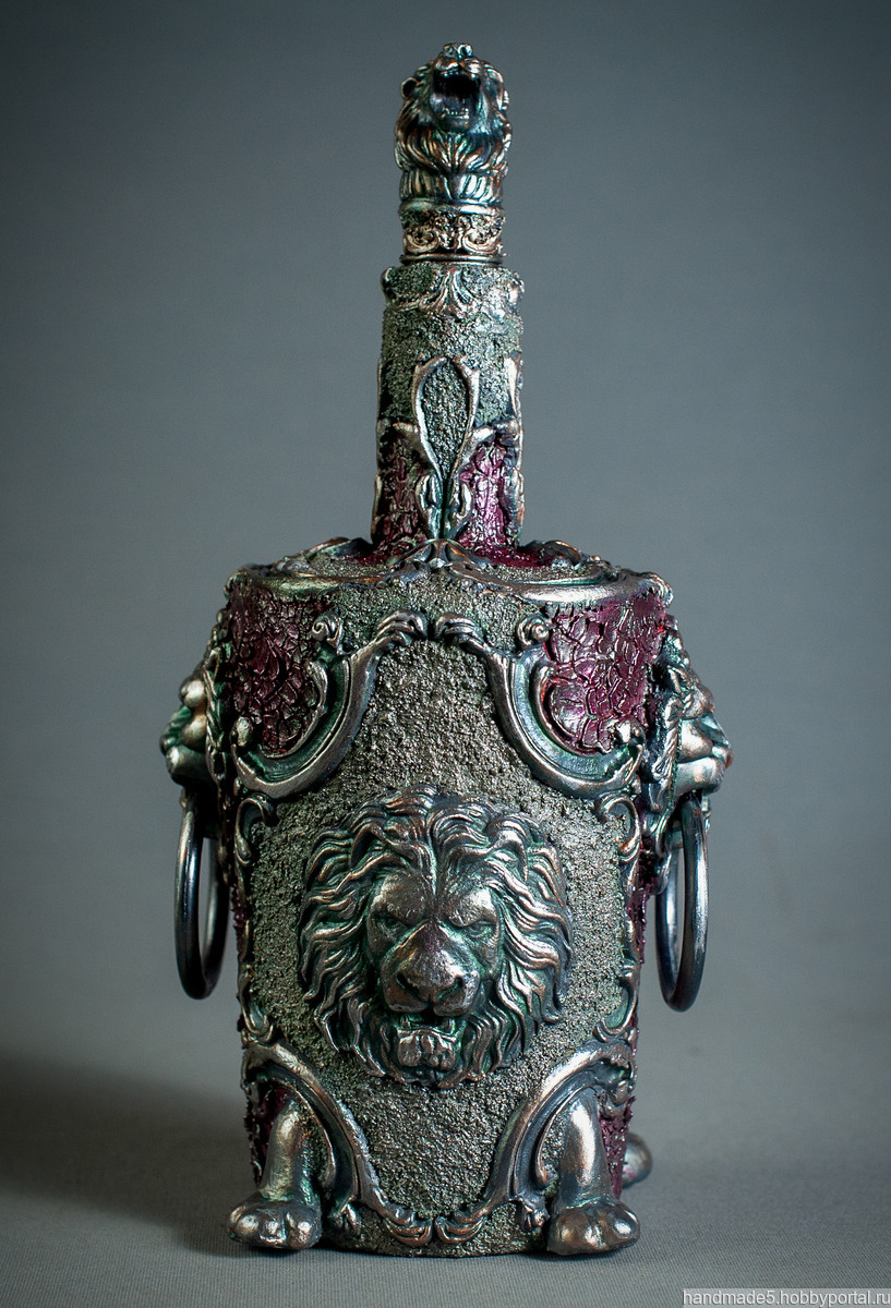 Бутылочка авторской ручной работы Готический Лев выполнена в смешанных приёмах декорирования с использованием разных рельефных фактур и техник исполнения. Такая бутылочка придётся очень кстати кто родился под знаком льва.