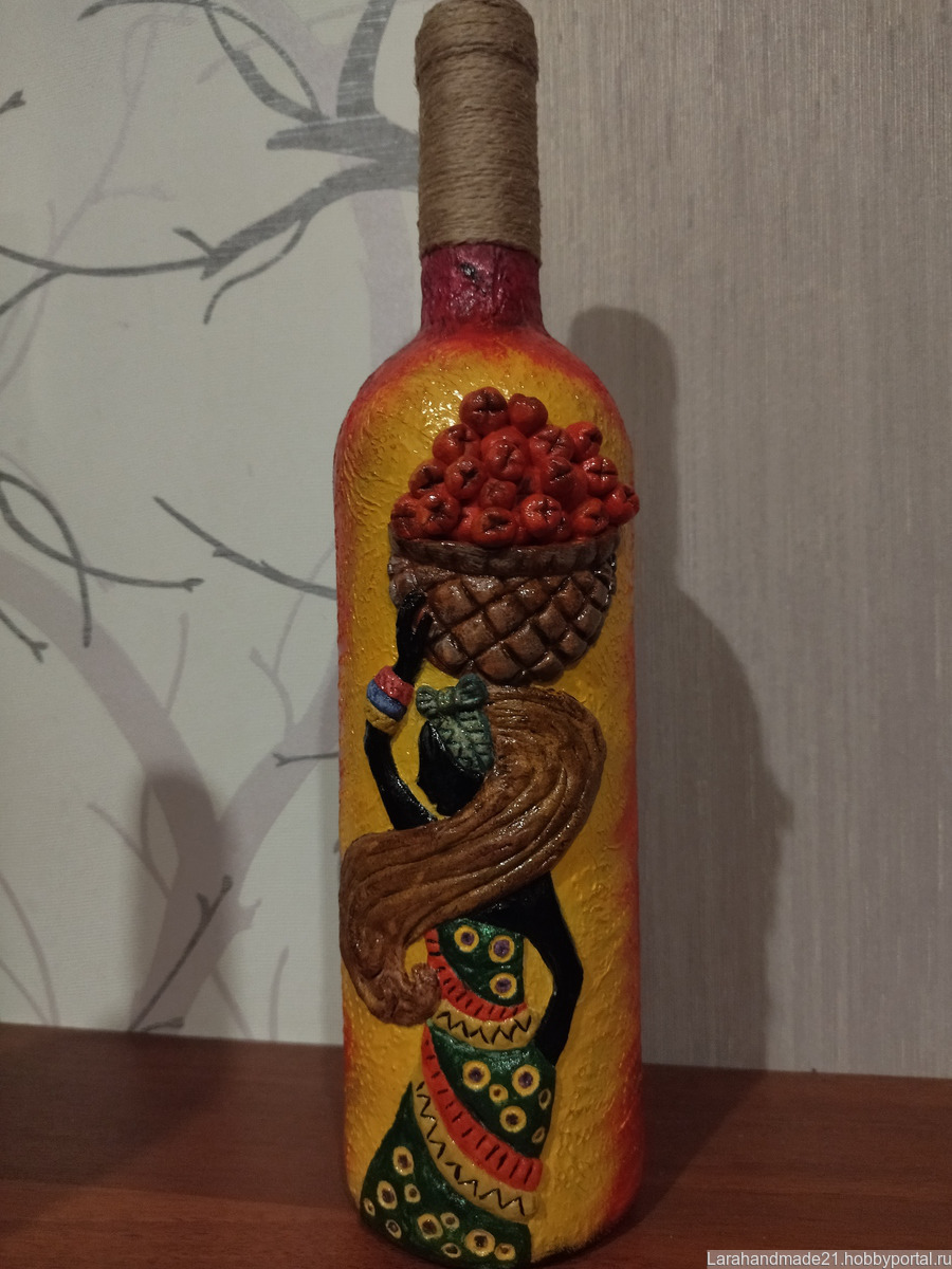 Бутылка декорирована бумажными салфетками, солёным тестом, окрашена гуашью, покрыта акриловым лаком. Может быть использована под любые напитки или как ваза, не замачивать, не использовать абразивные средства для мытья. При аккуратном использовании прослужит долгое время.