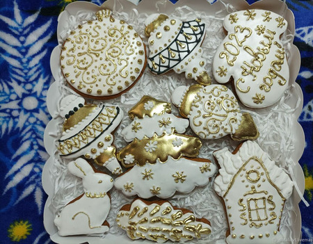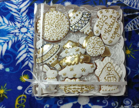 Большой набор ароматных имбирных пряников расписан в бело-золотой праздничной цветовой гамме. В наборе 9 пряников разного размера и формы от 7-8 до 10 см размером. Коробка 20 на 20 см. Сделаю на заказ с учетом ваших пожеланий по ассортименту пряников.