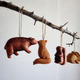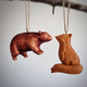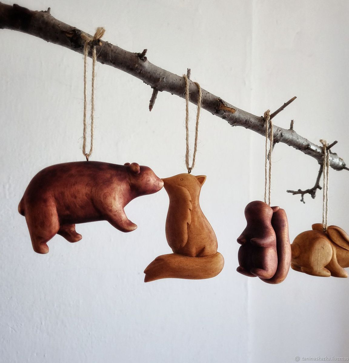Набор игрушек для украшения ёлочки включает зайку, лисичку, медведя и белочку. Каждая фигурка индивидуальна, вырезана вручную из дерева, пропитана морилками и маслом, имеют подвесы.