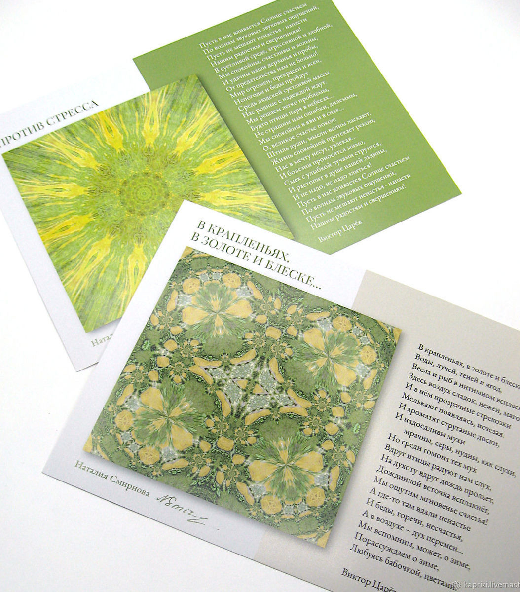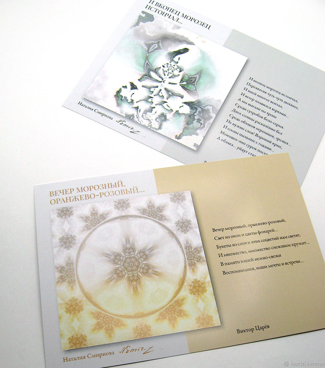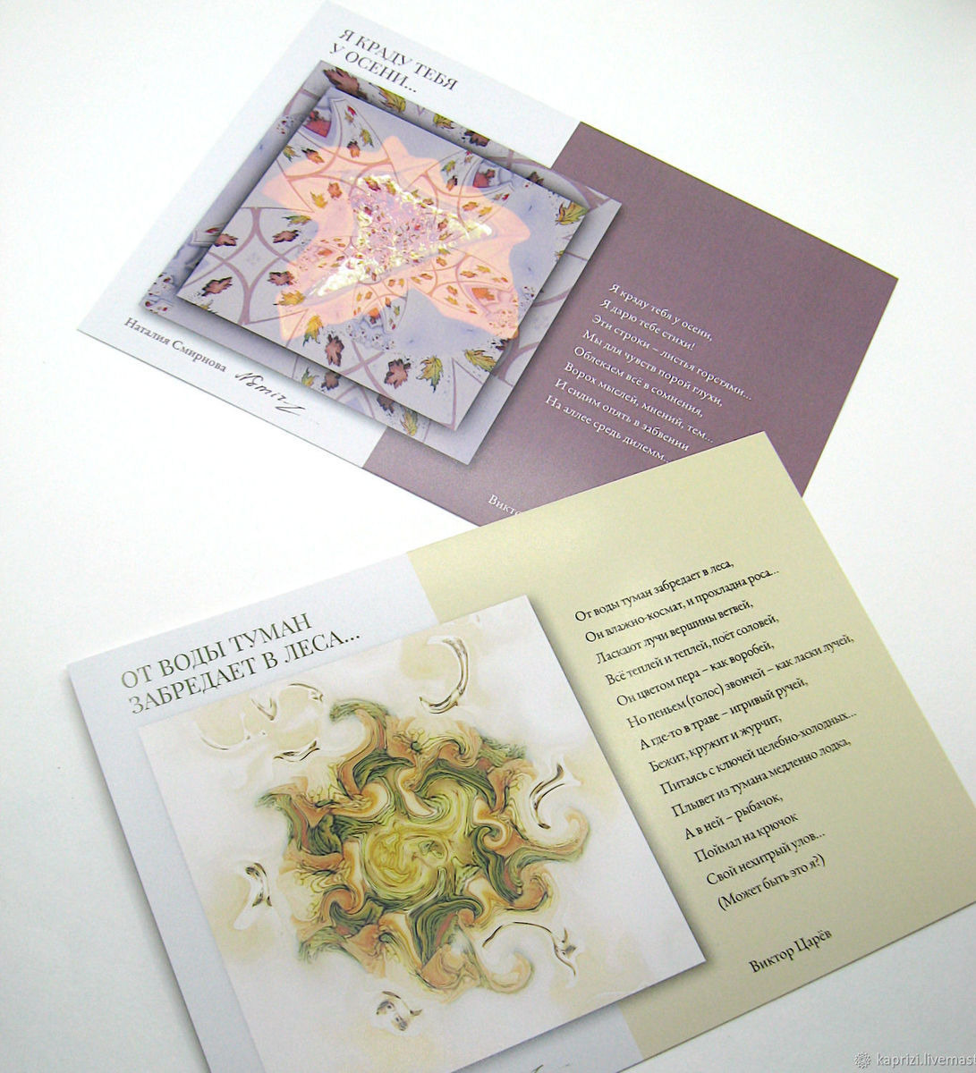 Авторский набор открыток "Зеркала" для любителей поэзии (лимитированный тираж). Иллюстрации Наталии Смирновой (дизайнер, член Творческого Союза Художников России), стихи художника и поэта Виктора Царёва. Этот проект назван "Зеркала" по названию одного из 17 стихотворений, которые входили в цикл иллюстраций.