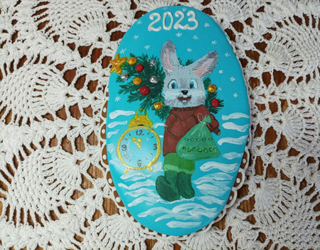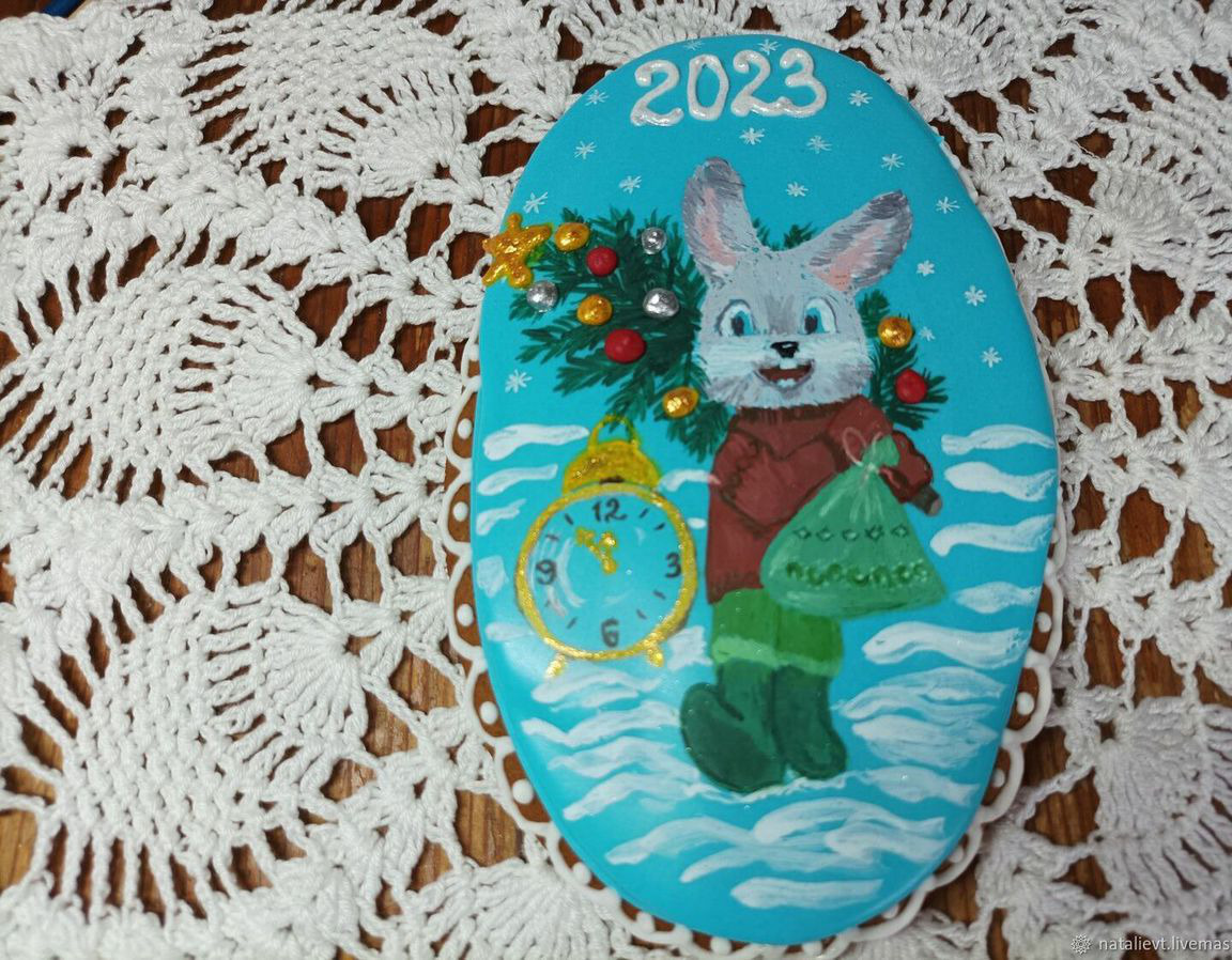 Ароматный имбирный пряник расписан в тематике наступающего 2023 года! Большой вкусный пряник Зайчик с елкой и новогодними часиками - отличный подарок и прекрасное дополнение новогоднего стола!