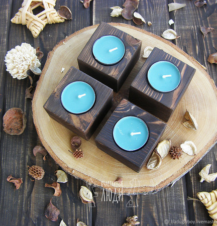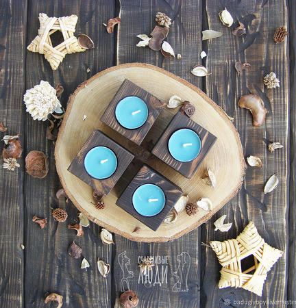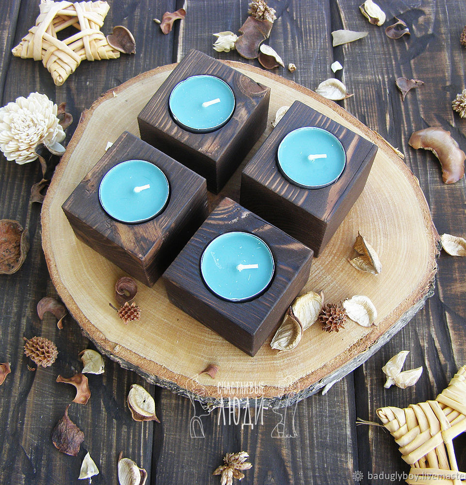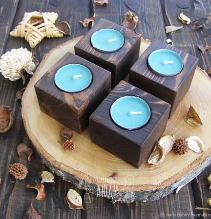 Подсвечник из дерева с зажженной свечой придаст уют комнате вечером. Подсвечник - отличный подарок на любой праздник.