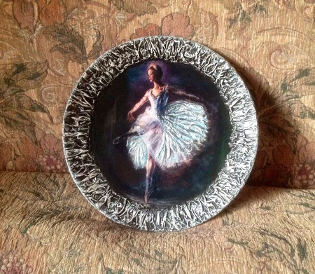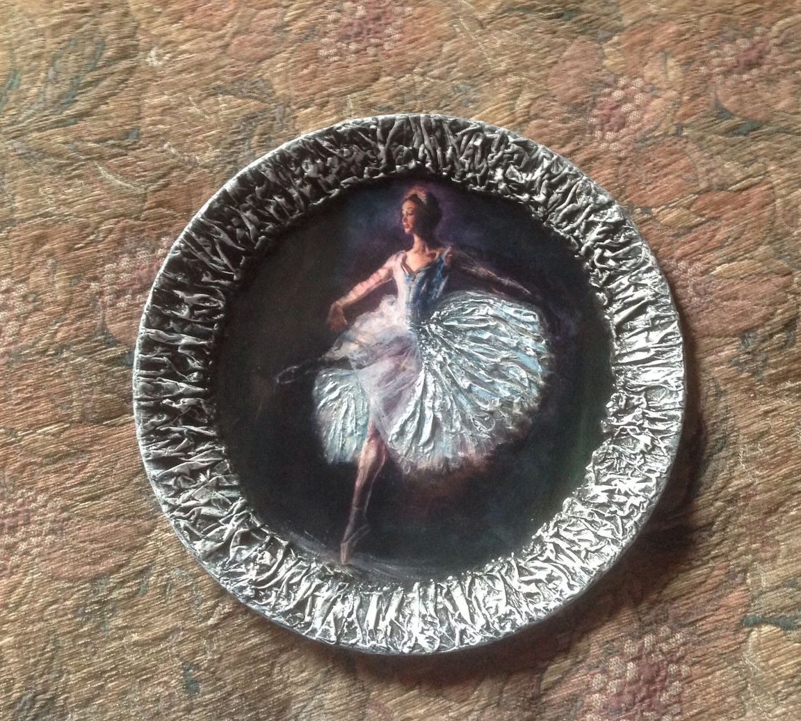 Декоративная тарелка изображение балерины выполнена в смешанной технике художественного Декупажа и объемного декора.