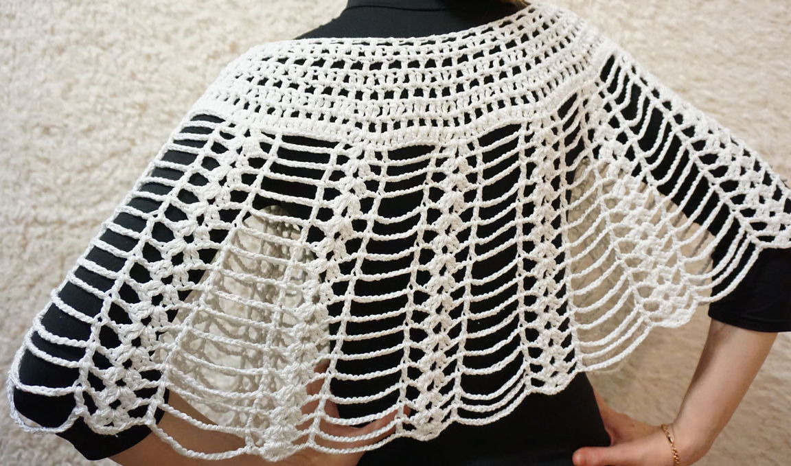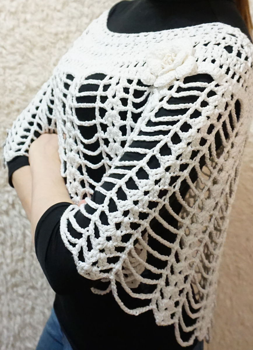 Пончо - накидка связано крючком круговым вязанием ( без швов) из вискозы молочного цвета. Украшена связанным объемным цветком с вышивкой в сердцевине из шелка. Накидка - пончо может скрыть дефекты фигуры и украсит любой скромный наряд.