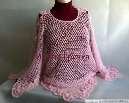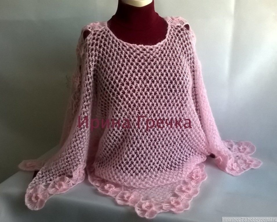 Элегантно выглядит пончо с пояском под джинсы, прямую юбку, платье прямого силуэта, брюки. Авторская ручная работа (на авторство не претендую, но ничего подобного не видела).