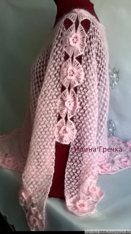 Работа выполнена на совесть, качественно, ни одной петельки не пропущено. Цветы ввязывала по одному. Уход за изделием прост и не требует особых усилий: в тёплую воду (комнатной температуры) с шампунью для волос положить изделие на некоторое время (стирать руками не надо), выложить в дуршлаг, дать стечь и смело (не боясь, что изделие растянется) вывесить сушиться. После стирки пончо сохраняет форму, не садится, не растягивается.