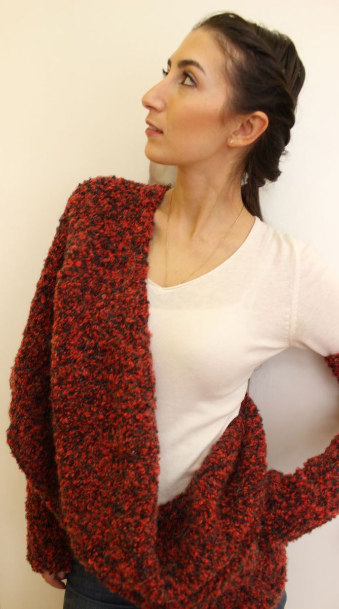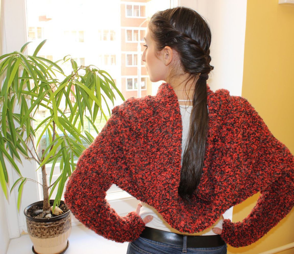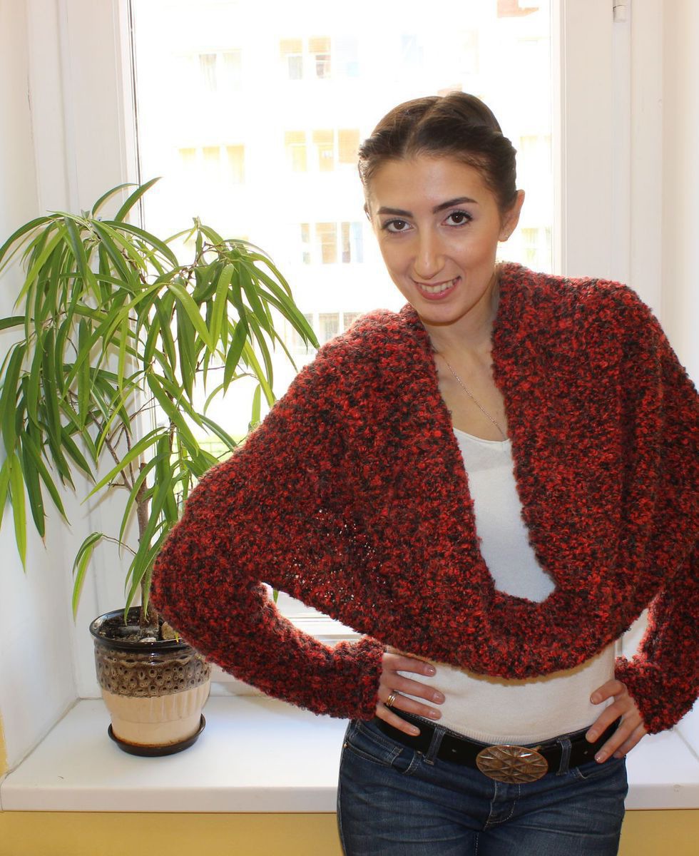 Связан на спицах из фантазийной пряжи, объемной и мягкой.