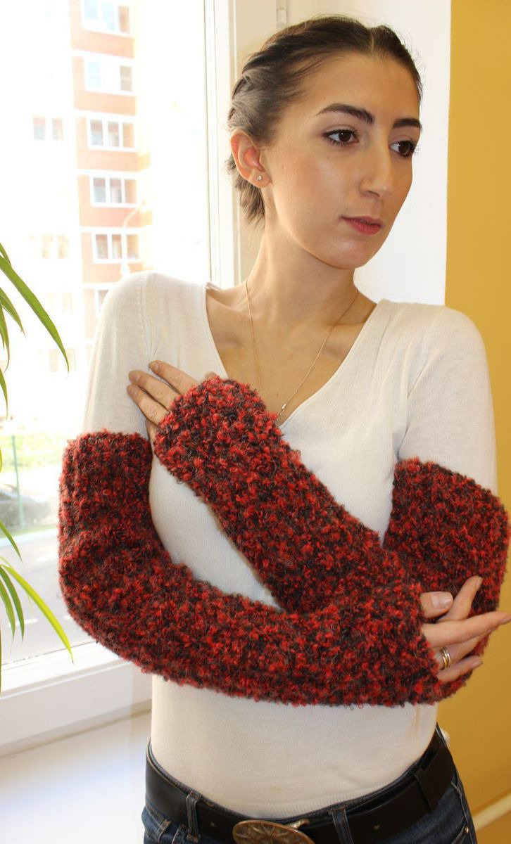 Вязаные рукава будут всегда интересно смотреться под жилет. В этом комплекте рукава можно носить самостоятельно под пончо-снуд.