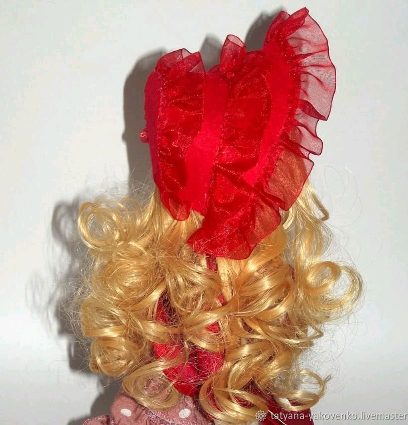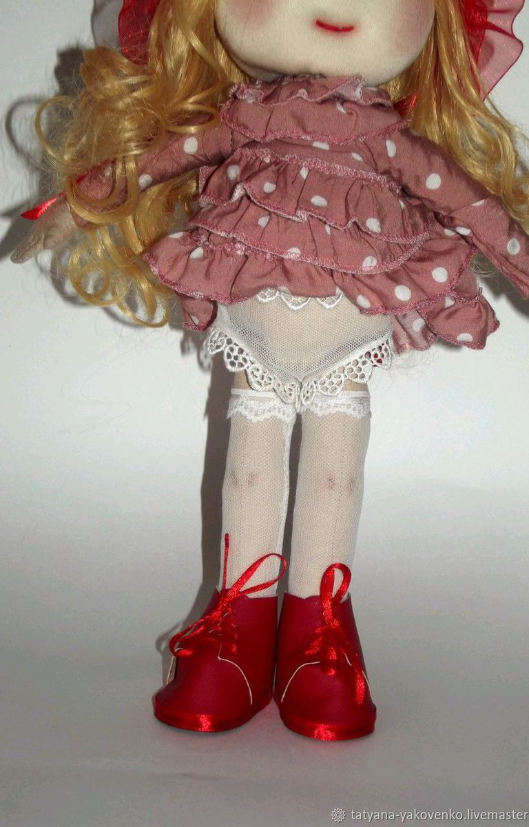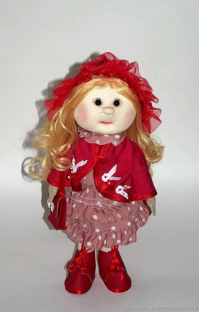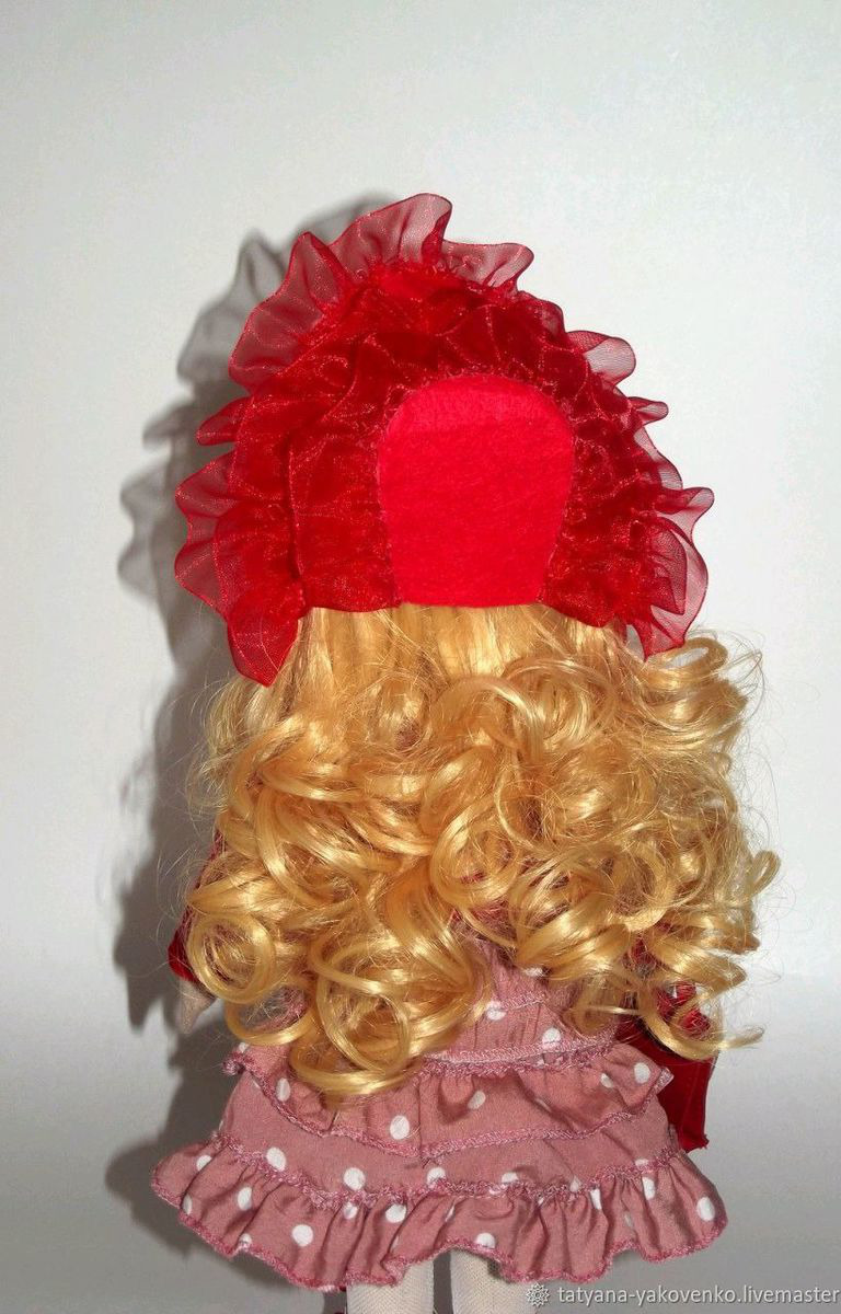 Кукла текстильная ручной работы в платье в горошек и красном капоре. Кружевные трусики и чулочки. Вся одежда съёмная.Есть возможность заказать дополнительный комплект одежды. Отличный подарок для ребенка.