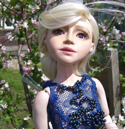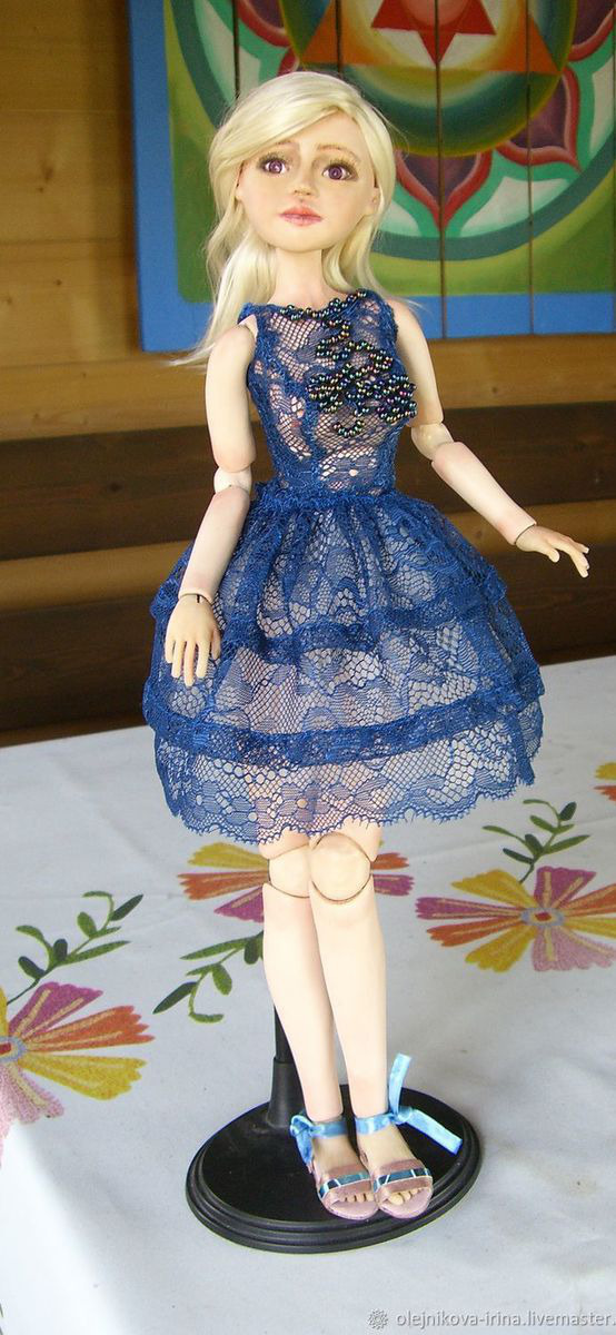 Флюмо, роспись – акрил, акварель и пастель, закрепленные лаком. Парик шерсть козы. Кружево, вышивка бисер.
