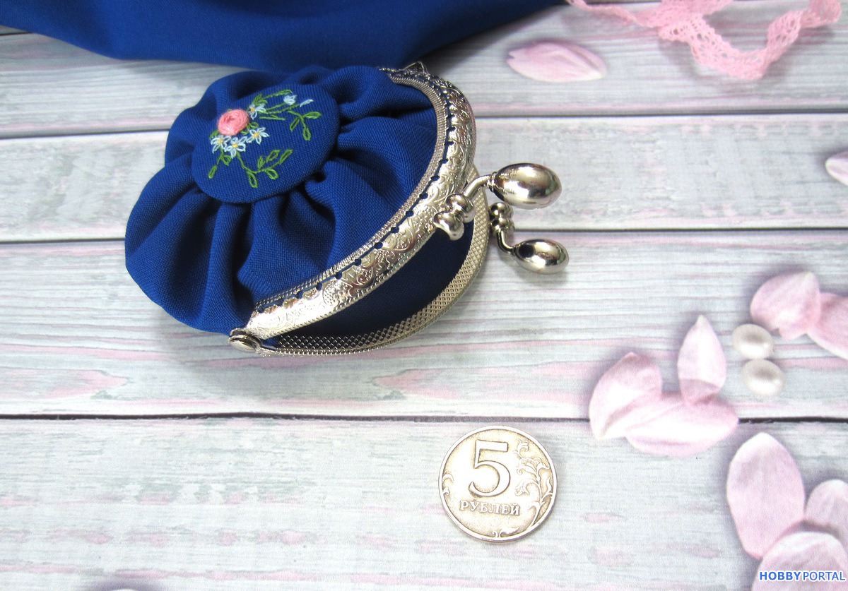 Миленький кошелёчек-монетница небольшого размера, уютно помещается на ладони. Серебристый фермуар придаёт ему винтажное "настроение", а миниатюрные вышитые незабудки и розочки - романтичное.