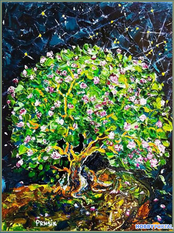 В картине Дерево с розами я изобразила тот параллельный мир, где розы круглый год растут именно на больших деревьях. Цветков на дереве огромное количество. Своим благоуханием они радуют свой мир. Я представляю, какая красивая жизнь в параллельном мире! Когда пишу картину, испытываю счастье, потому что я как будто присутствую в той реальности. И вот картина готова. В моих планах продолжать работу над серией Параллель.