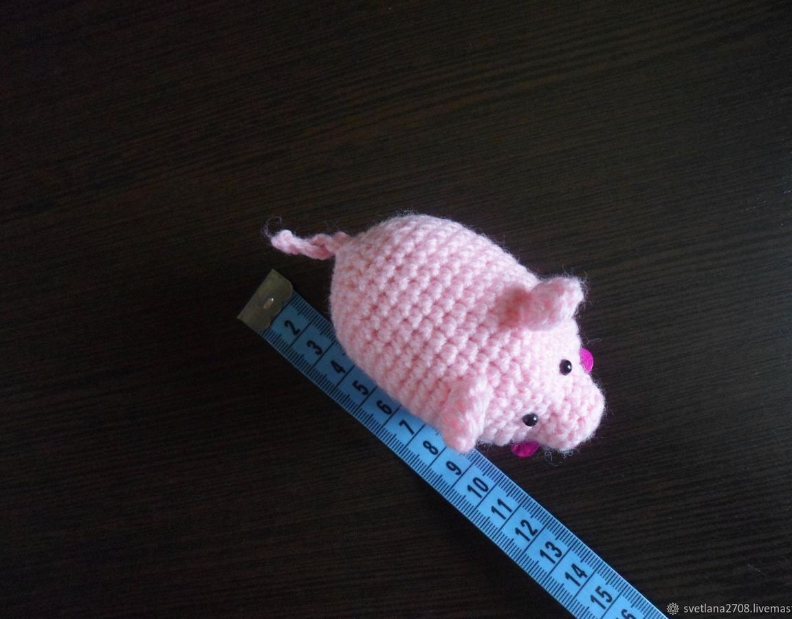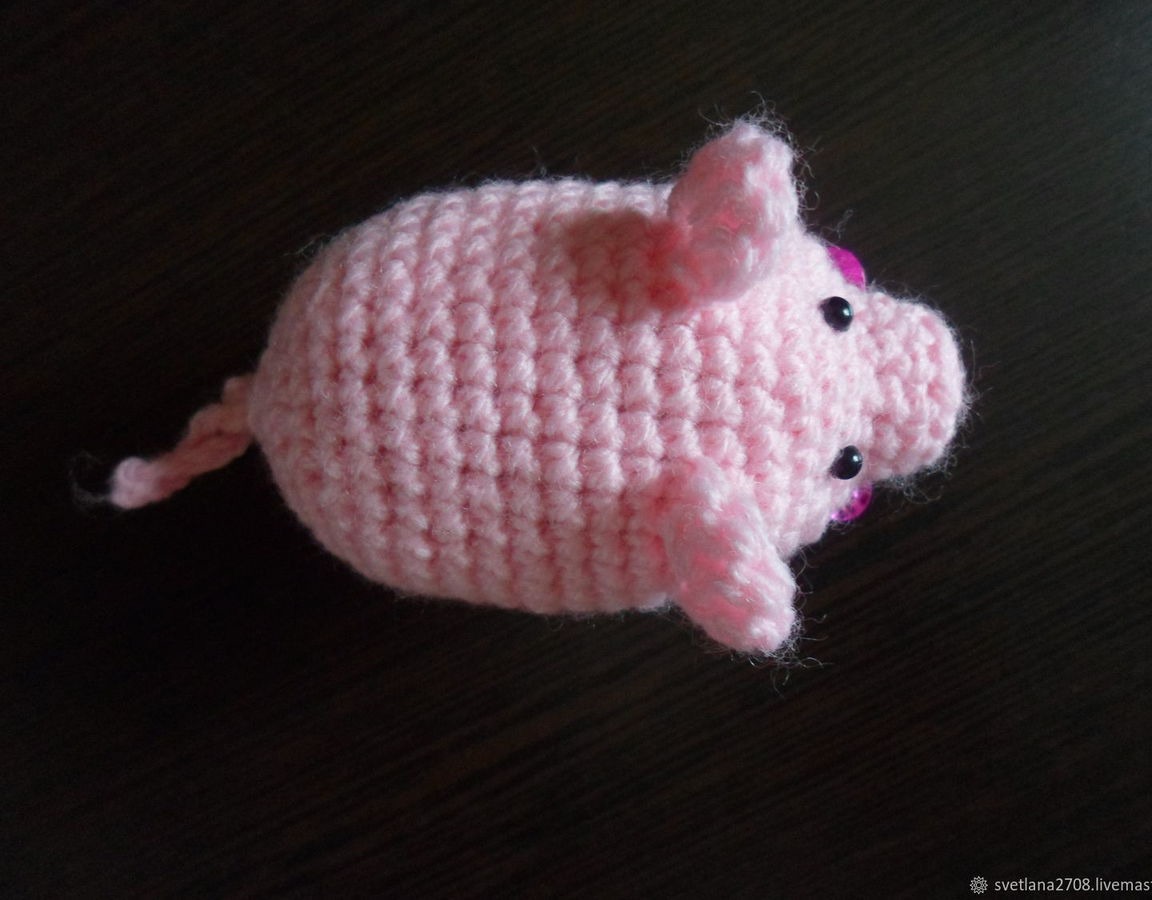 Поросёнок связан крючком, из детской пряжи (акрил). Под мордочкой пришит бантик из пластика, розового цвета. Бантиков хватит на 50 свинок. Поэтому перед заказом уточняйте, с бантиком будет или нет. На спинке можно сделать петельку и повесить на ёлку. Петелька по желанию)))