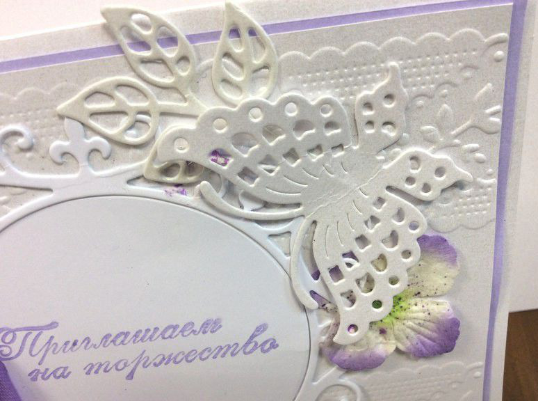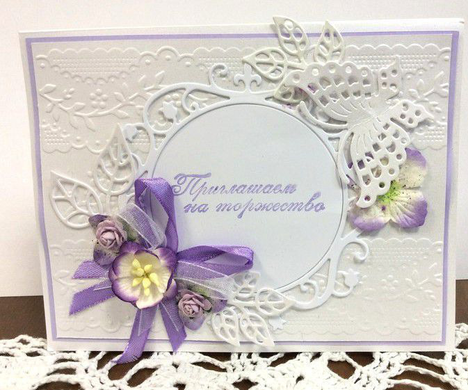 Приглашение оформлено в пастельных сиреневых тонах. Многодетальное и многослойное! Украшено тиснением, лентами, большим количеством вырубки, цветами, внутри будет напечатан любой текст под заказ, возможно на кальке.