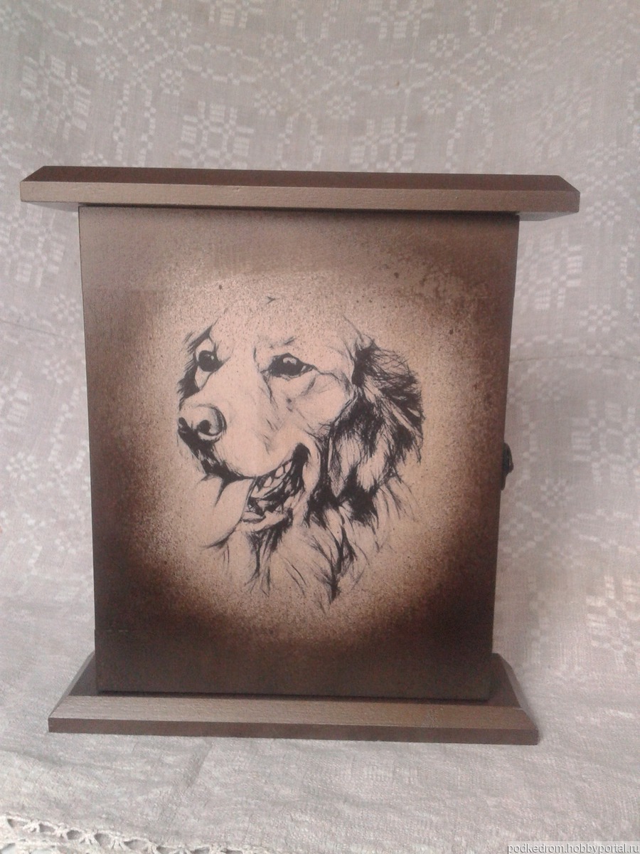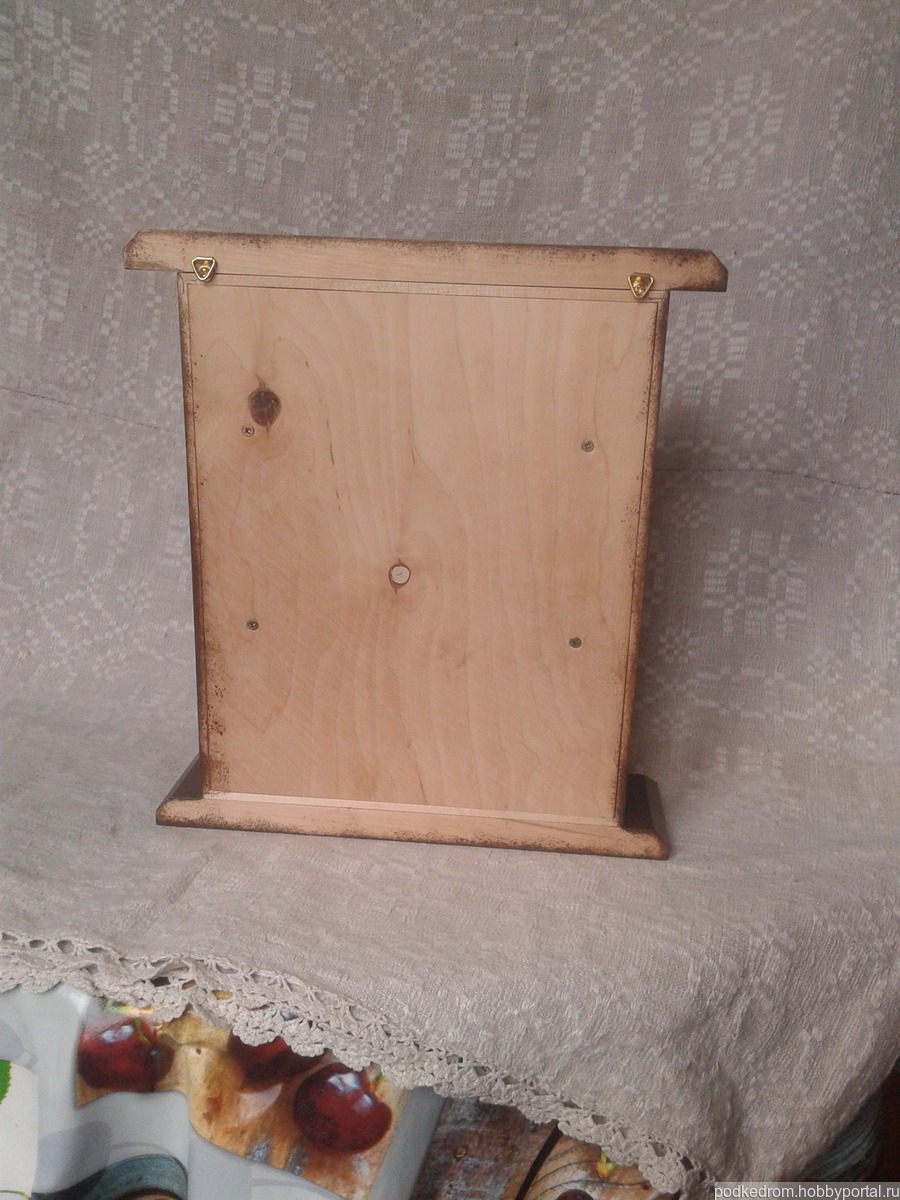 Размеры: 31*28*7см. Изготовлена из дерева (береза). Задник из фанеры. Металлическая фурнитура под бронзу. Окрашена морилкой, акриловой краской, акриловым лаком. Изображение на дверце нанесено методом декупажа. Ключница может быть использована как настенно, так и настольно