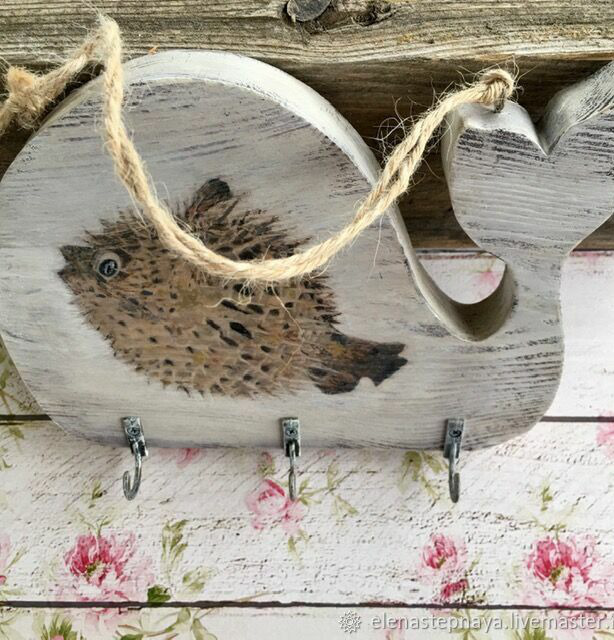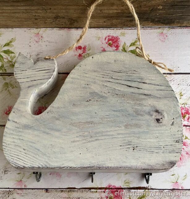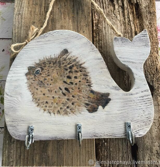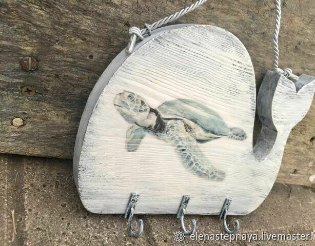 Ключница или вешалка на 3 крючка из сосны, оригинальной формы, в виде кита. Дерево брашировано, покрыто морилкой. Деликатное старение, декупаж. Веревочный подвес. В наличии - с рыбкой. С черепашкой - на заказ.