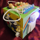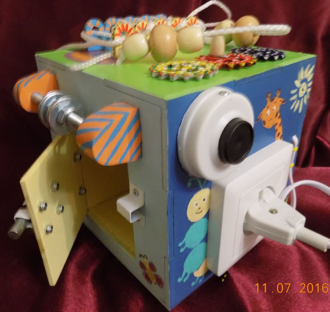 Удобный маленький размер для малышей. Не требует крепления. Есть ручка для переноса с бусинами, шнуровка, дверца на щеколде с местом для хранения, шайбы и болтики на шпильке, шестеренки, кармашек на молнии, колокольчики разных размеров, колесико, розетка с вилкой, светильник включается и выключается выключателем, при нажатии кнопки звонка играет мелодия и загорается лампочка красным цветом в солнышке.