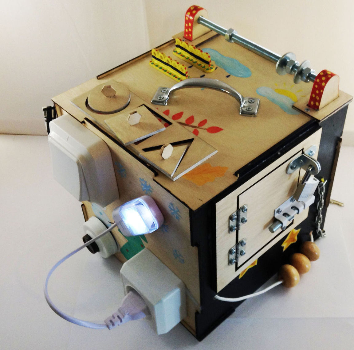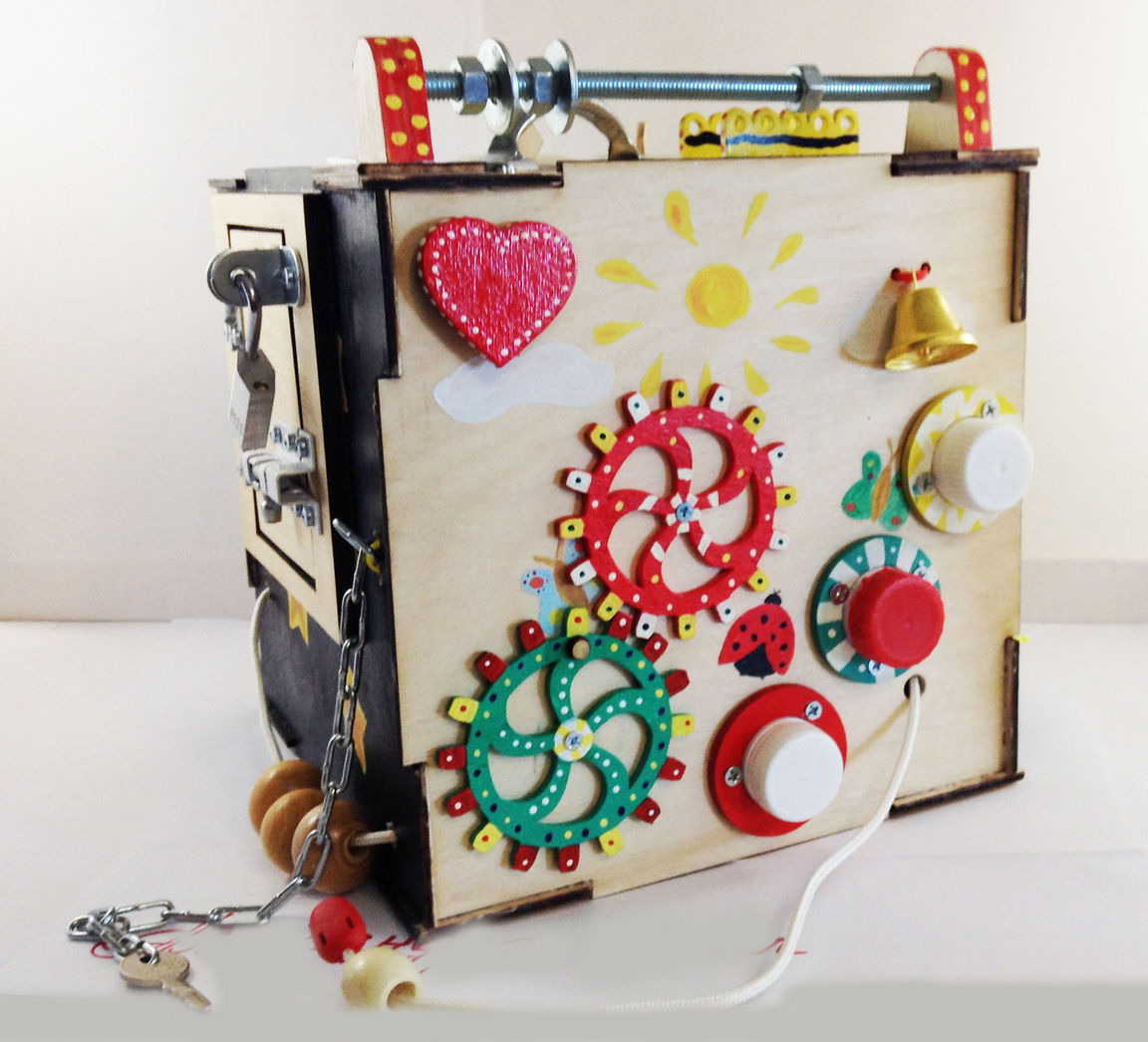 Необычная игрушка развивающий бизиборд. Светильник включается с помощью выключателя и кнопки звонка. Колокольчик, шестеренки, крышки закручивающиеся и многое другое интересно малышам и способствует развитию моторики, внимания, памяти. На сторонах куба изображены времена года и суток.