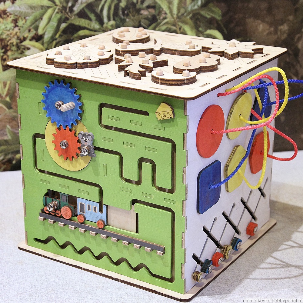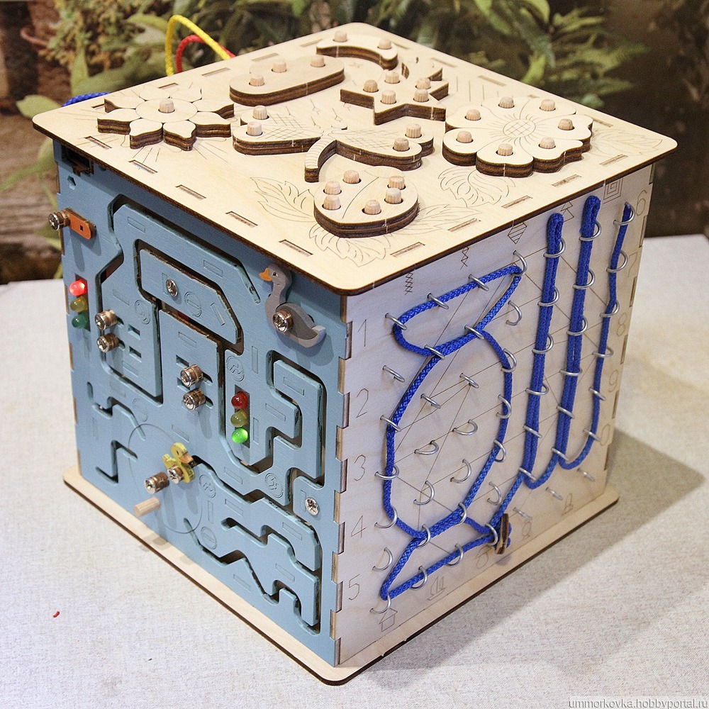 Развивающий бизикуб 24х24х26см. Выполнен из фанеры 4мм.