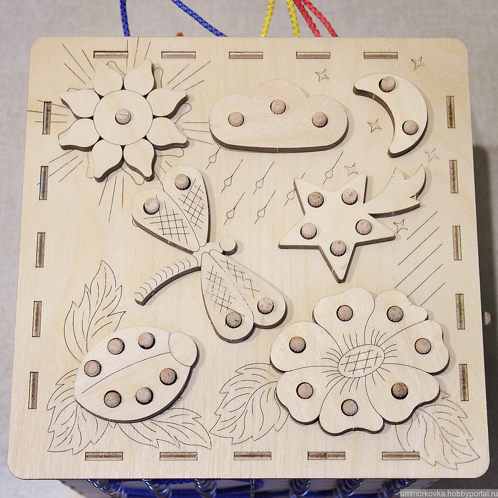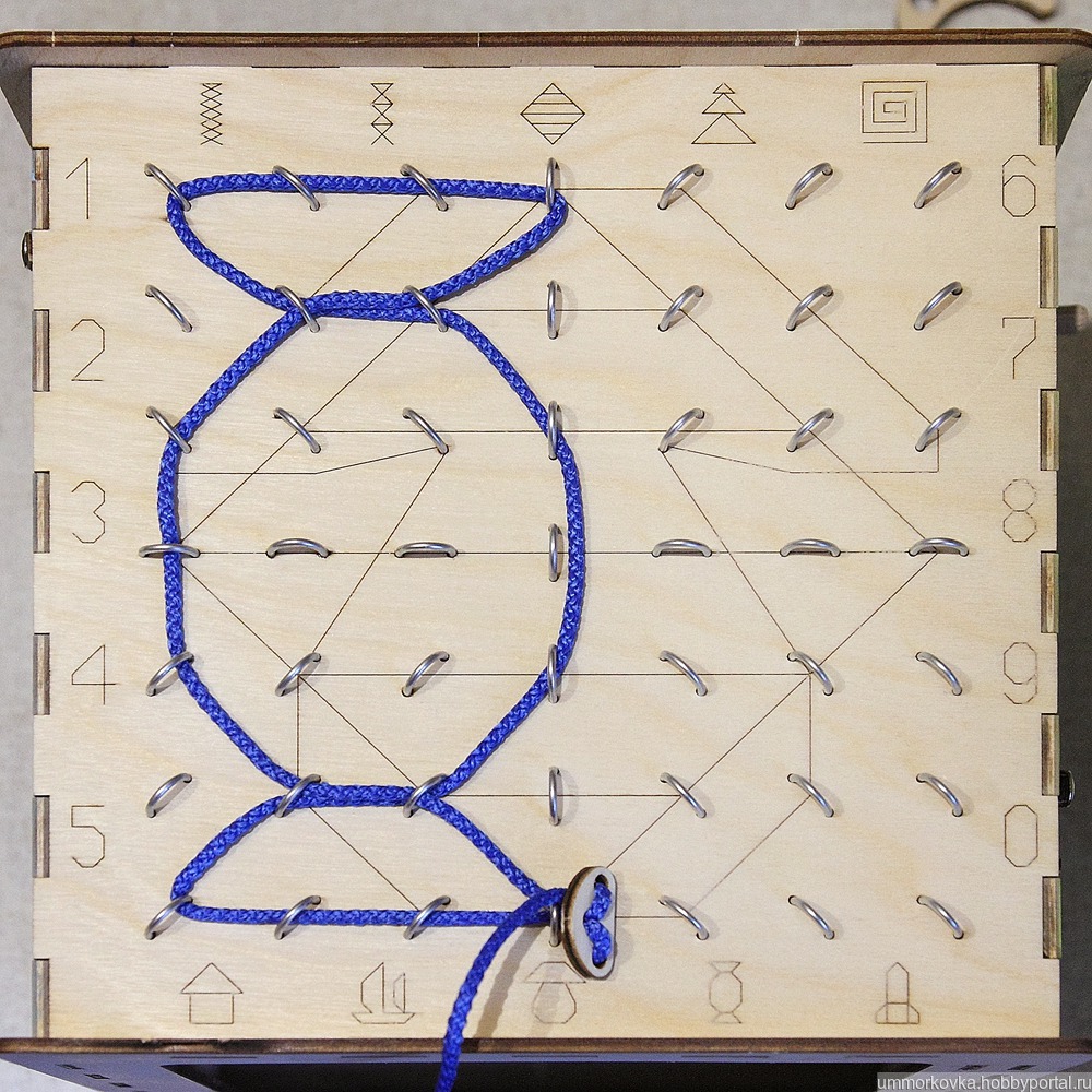 Третья сторона – настоящий клондайк для родителей, если малыш осознает шнуровку. По периметру стороны указаны возможные фигуры. Но если ребенок войдет во вкус, он сможет создавать изображения, подвластные лишь его воображению. Это занятие сможет занять его не на один час. Также возможно расширение списка указанных фигур – все зависит только от вашей фантазии.