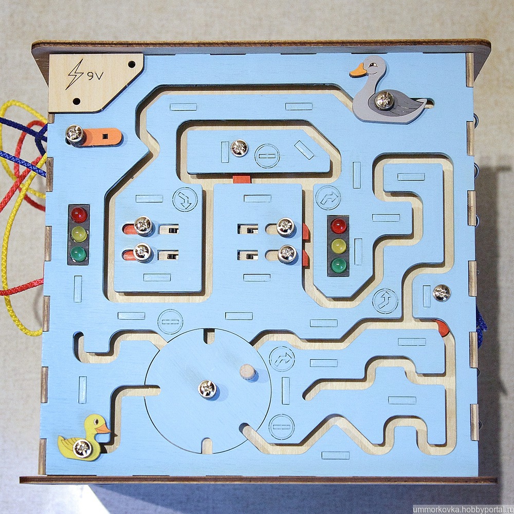 И, наконец, четвертая сторона – еще один квест: нужно провести утенка к маме – утке. Здесь добавляются не сложные лабиринты. Если ребенок завел утенка в тупик – нужно возвращаться. В квесте предусмотрены две красные преграды, которые пропускают утенка в одну сторону, но не дают вернуться той же дорогой. Пройти правильной дорогой помогут знаки дорожного движения. А на пути утенка заставят остановиться светофоры. На красный пути нет – дорогу перекрывают две преграды. При смещении одного ползунка для удаления преграды, переключит светофор на желтый свет. Перемещение второго ползунка убирает вторую преграду и включает зеленый. Светофоры синхронны. Включив зеленый на одном, ребенок автоматически включит красный на другом. Работают светофоры от одной батарейки «Крона». Вот так играя, подсознательно ребенок запоминает некоторые правила дорожного движения.