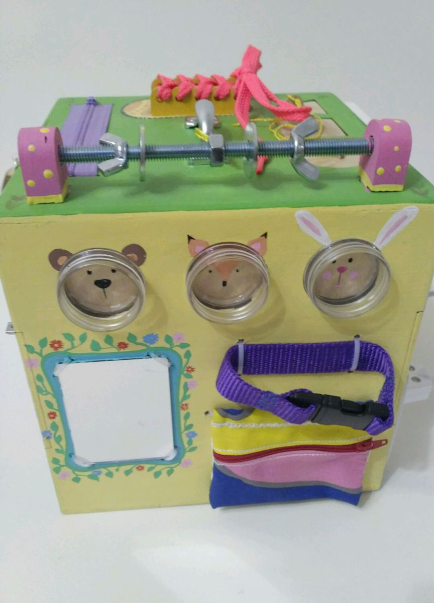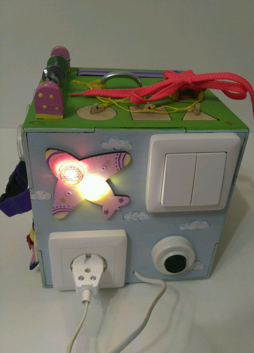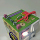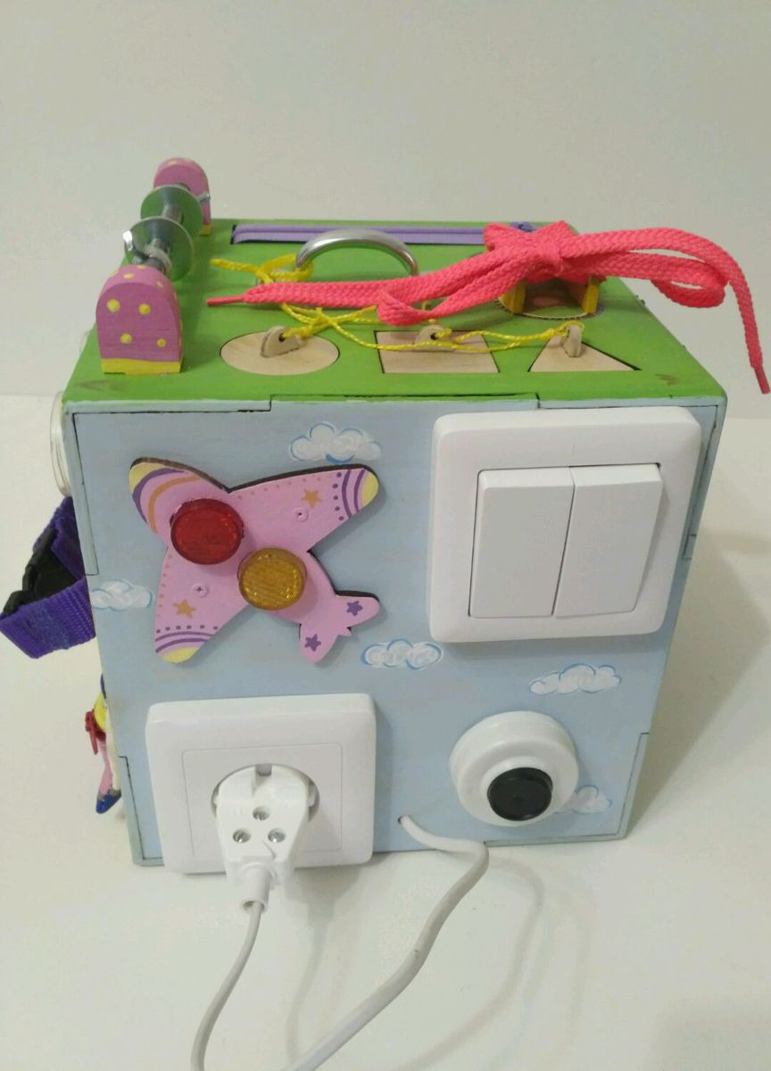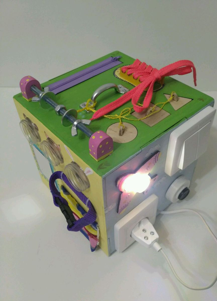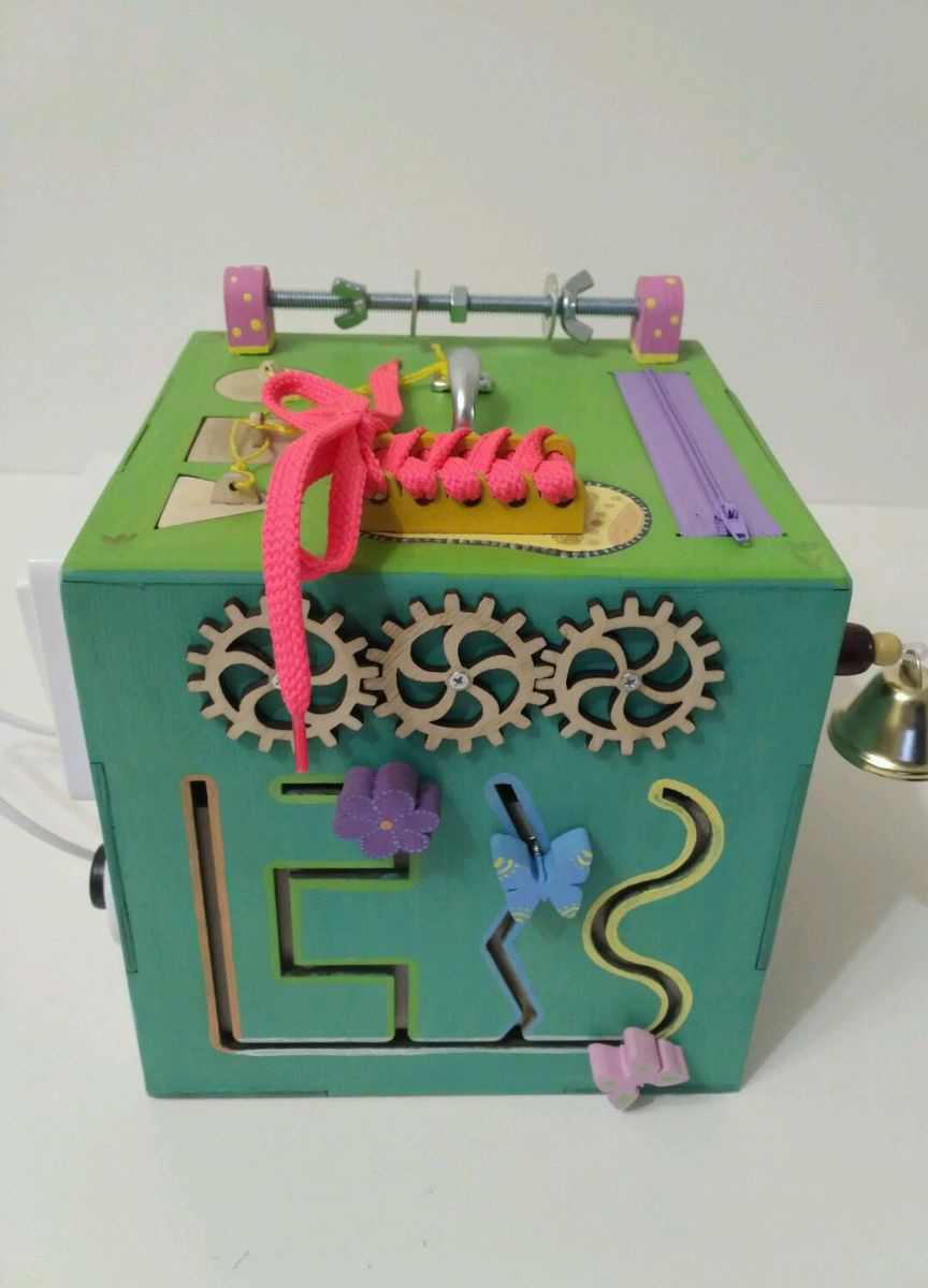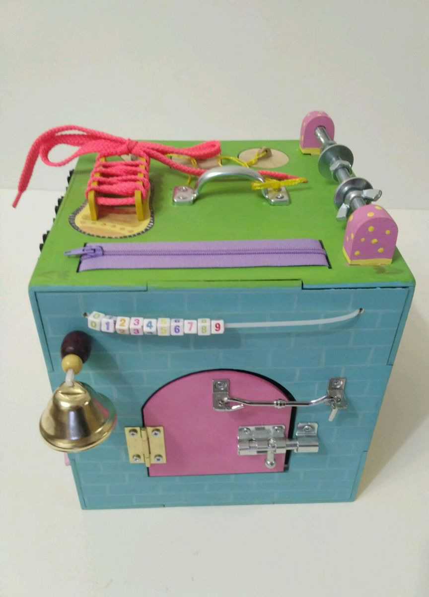 Также на кубе ручка для переноса, зеркальце пластиковое Икея, шнуровка, молния, фастекс, колокольчик, лабиринт, шестерёнки, крышки,кармашек на молнии,сортер "Геометрия", шпилька с гайками, вертушкой и шайбами.
